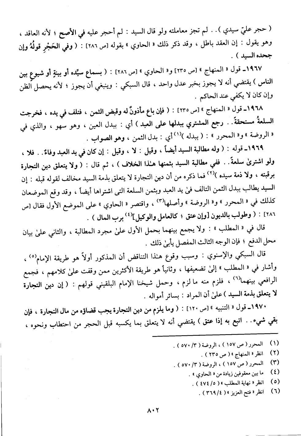 1969 - قوله: (وله مطالبة السيد أيضًا، وقيل: لا، وقيل: إن كان في يد العبد وفاءٌ .. فلا، ولو اشترى سلعةً .. ففي مطالبة السيد بثمنها هذا الخلاف)، ثم قال: (ولا يتعلق دين التجارة برقبته، ولا ذمة سيده) (¬2) فما ذكره من أن دين التجارة لا يتعلق بذمة السيد مخالف لقوله قبله: إن السيد يطالب ببدل الثمن التالف فى يد العبد وبثمن السلعة التى اشتراها أيضًا، وقد وقع الموضعان كذلك في "المحرر" و"الروضة" وأصلها (¬3)، واقتصر "الحاوي" على الموضع الأول فقال [ص 286]: (وطولب بالديون [وإن عتق؛ كالعامل والوكيل] (¬4) برب المال).