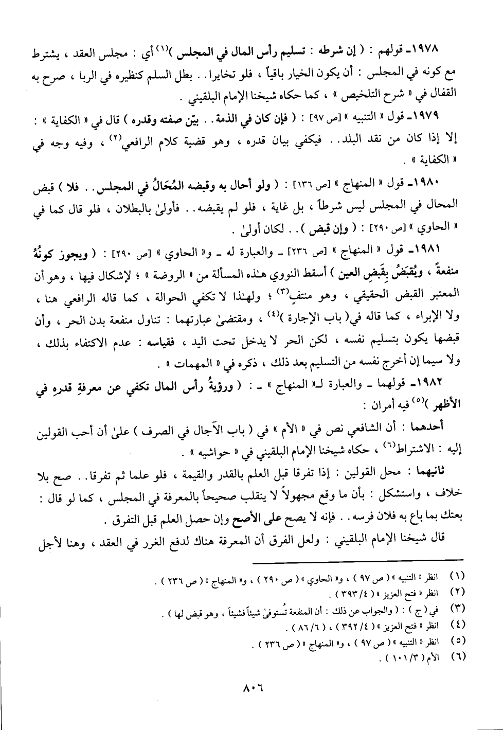 1982 - قولهما - والعبارة لـ"المنهاج" -: (ورؤيةُ رأس المال تكفي عن معرفةِ قدرهِ في الأظهر) (¬5) فيه أمران: