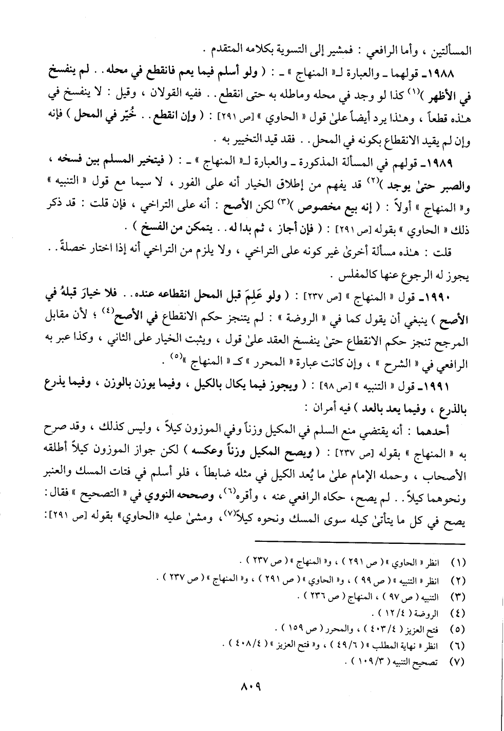 1990 - قول "المنهاج" [ص 237]: (ولو عَلِمَ قبل المحل انقطاعه عنده .. فلا خيارَ قبلهُ في الأصح) ينبغي أن يقول كما في "الروضة": لم يتنجز حكم الانقطاع في الأصح (¬4)؛ لأن مقابل المرجح تنجز حكم الانقطاع حتَّى ينفسخ العقد على قول، ويثبت الخيار على الثاني، وكذا عبر به الرافعي في "الشرح"، وإن كانت عبارة "المحرر" كـ "المنهاج" (¬5).
