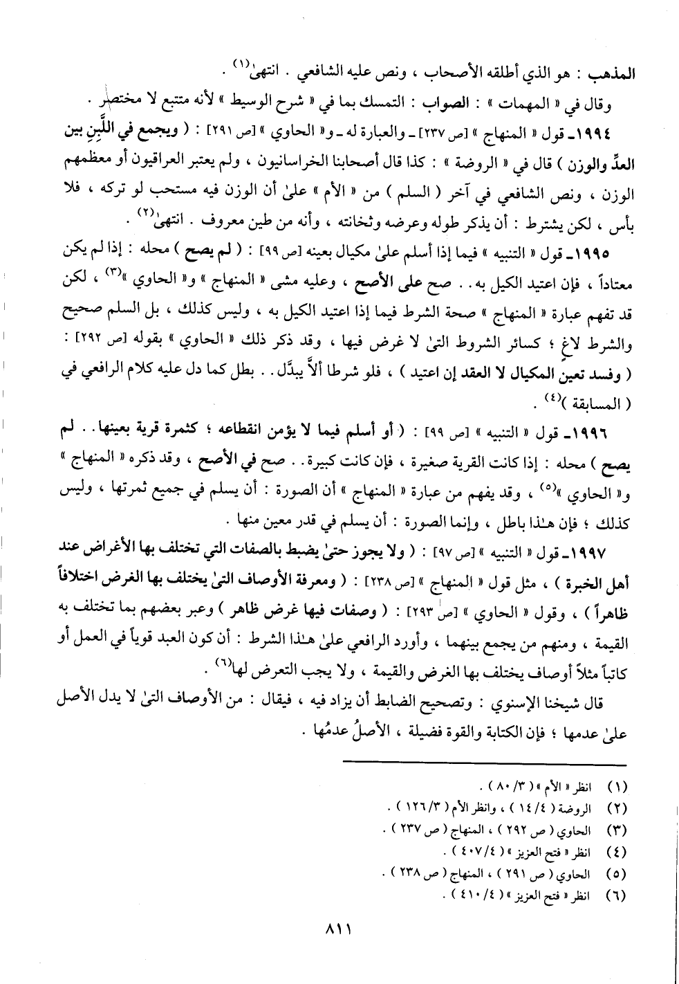 1997 - قول "التنبيه" [ص 97]: (ولا يجوز حتَّى يضبط بالصفات التي تختلف بها الأغراض عند أهل الخبرة)، مثل قول "المنهاج" [ص 238]: (ومعرفة الأوصاف التى يختلف بها الغرض اختلافًا ظاهرًا)، وقول "الحاوي" [ص 293]: (وصفات فيها غرض ظاهر) وعبر بعضهم بما تختلف به القيمة، ومنهم من يجمع بينهما، وأورد الرافعي على هذا الشرط: أن كون العبد قويا في العمل أو كاتبًا مثلًا أوصاف يختلف بها الغرض والقيمة، ولا يجب التعرض لها (¬6).