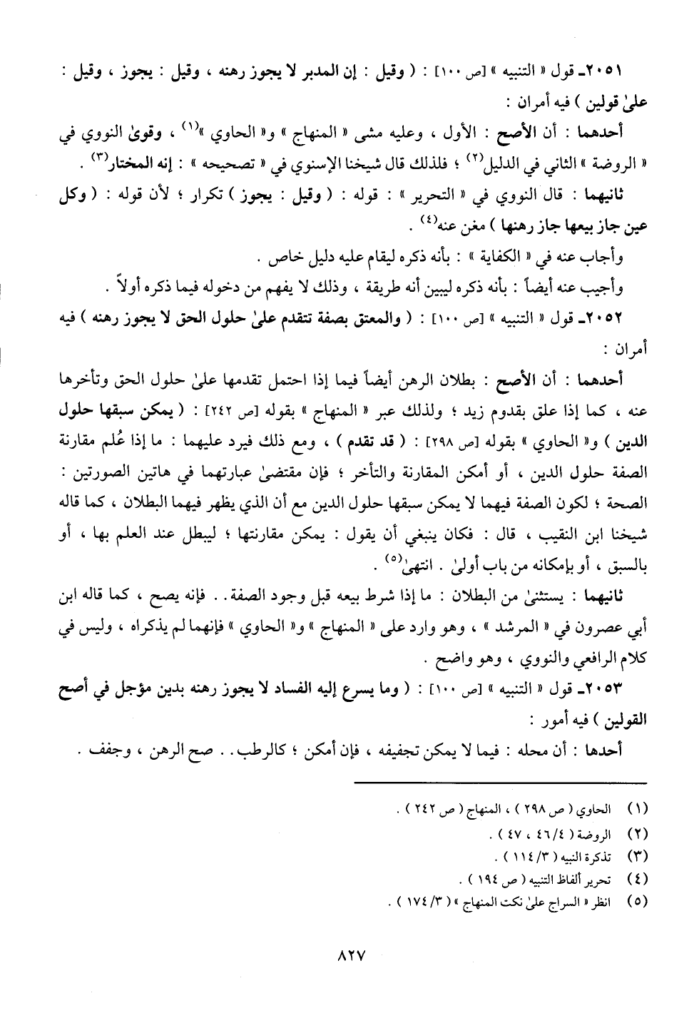 2051 - قول "التنبيه" [ص 100]: (وقيل: إن المدبر لا يجوز رهنه، وقيل: يجوز، وقيل: على قولين) فيه أمران: