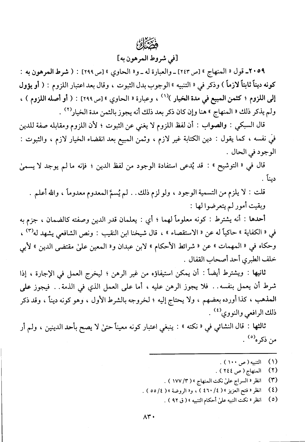 2059 - قول "المنهاج" [ص 243]- والعبارة له - و"الحاوي" [ص 299]: (شرط المرهون به: كونه دينًا ثابتًا لازمًا) وذكر في "التنبيه" الوجوب بدل الثبوت، وقال بعد اعتبار اللزوم: (أو يؤول إلى اللزوم؛ كثمن المبيع في مدة الخيار) (¬1)، وعبارة "الحاوي" [ص 299]: (أو أصله اللزوم)، ولم يذكر ذلك "المنهاج" هنا وإن كان ذكر بعد ذلك أنَّه يجوز بالثمن مدة الخيار (¬2).