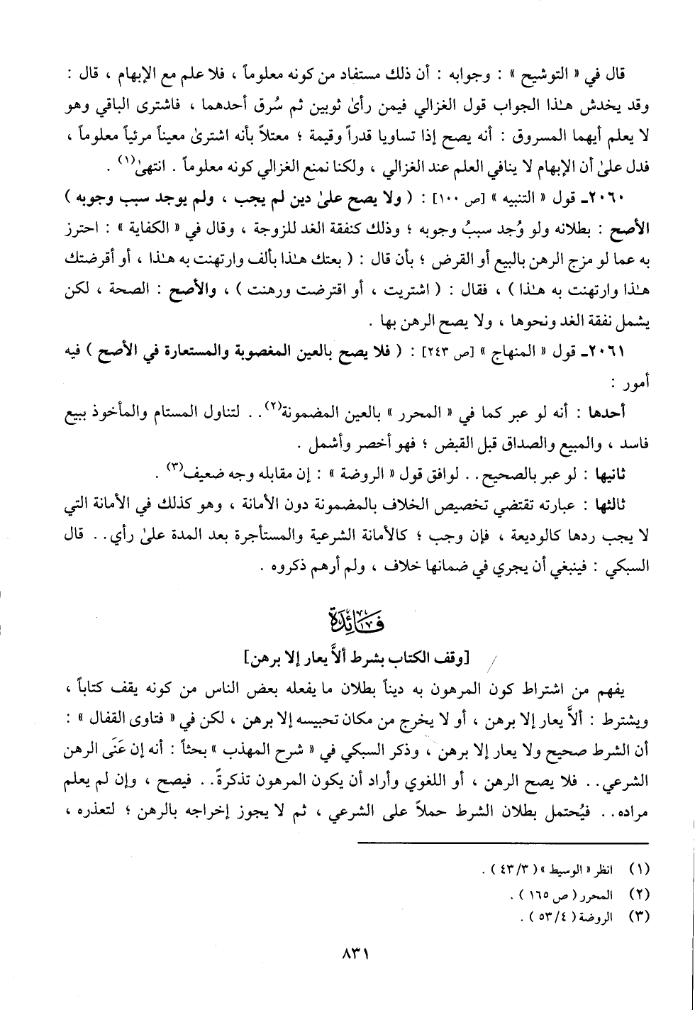 2060 - قول "التنبيه" [ص 100]: (ولا يصح على دين لم يجب، ولم يوجد سبب وجوبه) الأصح: بطلانه ولو وُجد سببُ وجوبه؛ وذلك كنفقة الغد للزوجة، وقال في "الكفاية": احترز به عما لو مزج الرَّهْن بالبيع أو القرض؛ بأن قال: (بعتك هذا بألف وارتهنت به هذا، أو أقرضتك هذا وارتهنت به هذا)، فقال: (اشتريت، أو اقترضت ورهنت)، والأصح: الصحة، لكن يشمل نفقة الغد ونحوها، ولا يصح الرَّهْن بها.
