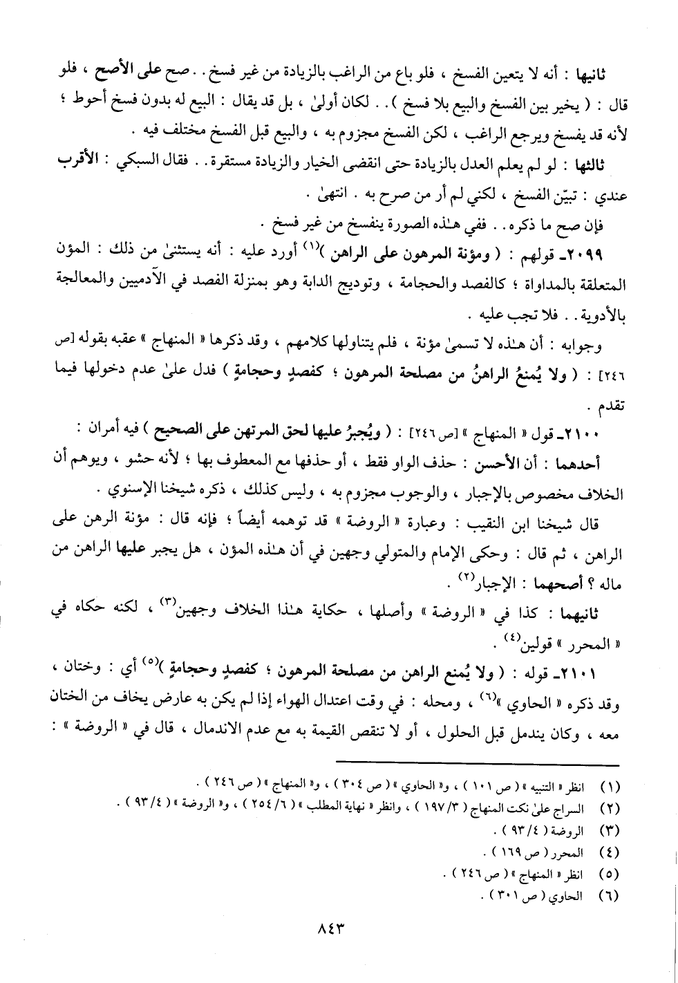 2099 - قولهم: (ومؤنة المرهون على الراهن) (¬1) أورد عليه: أنَّه يستثنى من ذلك: المؤن المتعلقة بالمداواة، كالفصد والحجامة، وتوديج الدابة وهو بمنزلة الفصد في الآدميين والمعالجة بالأدوية .. فلا تجب عليه.