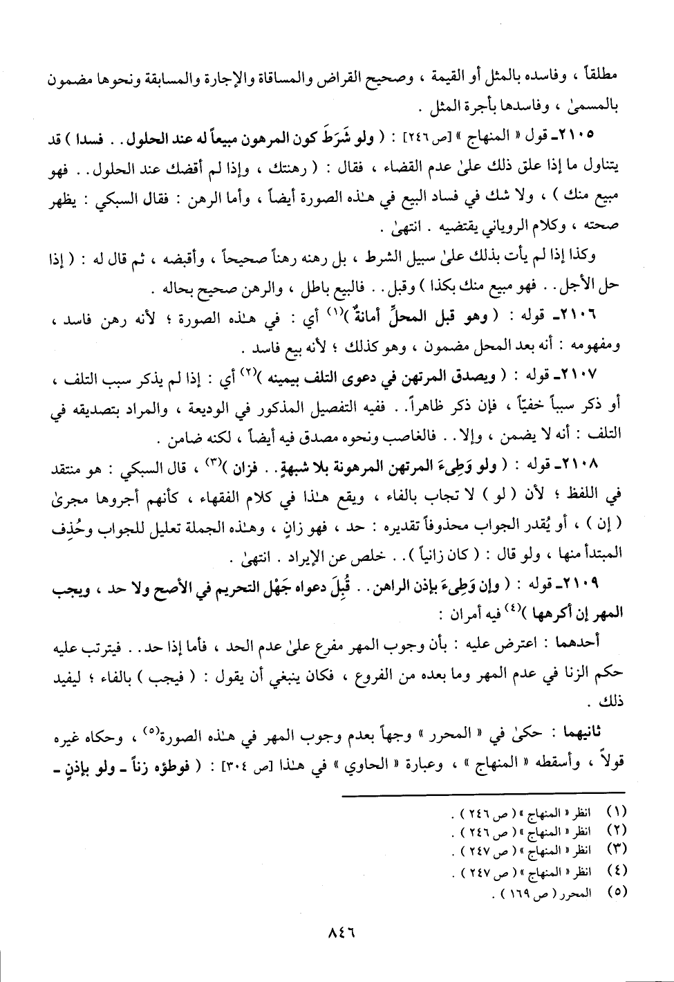 2105 - قول "المنهاج" [ص 246]: (ولو شَرَطَ كون المرهون مبيعًا له عند الحلول .. فسدا) قد يتناول ما إذا علق ذلك على عدم القضاء، فقال: (رهنتك، وإذا لم أقضك عند الحلول .. فهو مبيع منك)، ولا شك في فساد البيع في هذه الصورة أيضًا، وأما الرَّهْن: فقال السبكي: يظهر صحته، وكلام الروياني يقتضيه. انتهى.