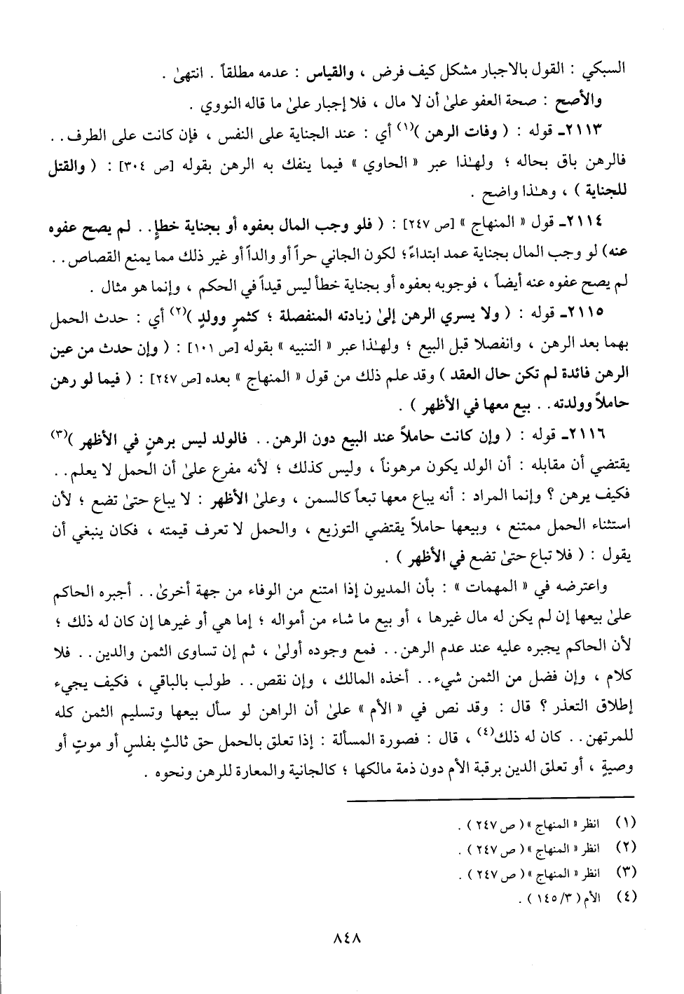 2115 - قوله: (ولا يسري الرَّهْن إلى زيادته المنفصلة؛ كثمرٍ وولدٍ) (¬2) أي: حدث الحمل بهما بعد الرَّهْن، وانفصلا قبل البيع؛ ولهذا عبر "التنبيه" بقوله [ص 101]: (وإن حدث من عين الرَّهْن فائدة لم تكن حال العقد) وقد علم ذلك من قول "المنهاج" بعده [ص 247]: (فيما لو رهن حاملًا وولدته .. بيع معها في الأظهر).