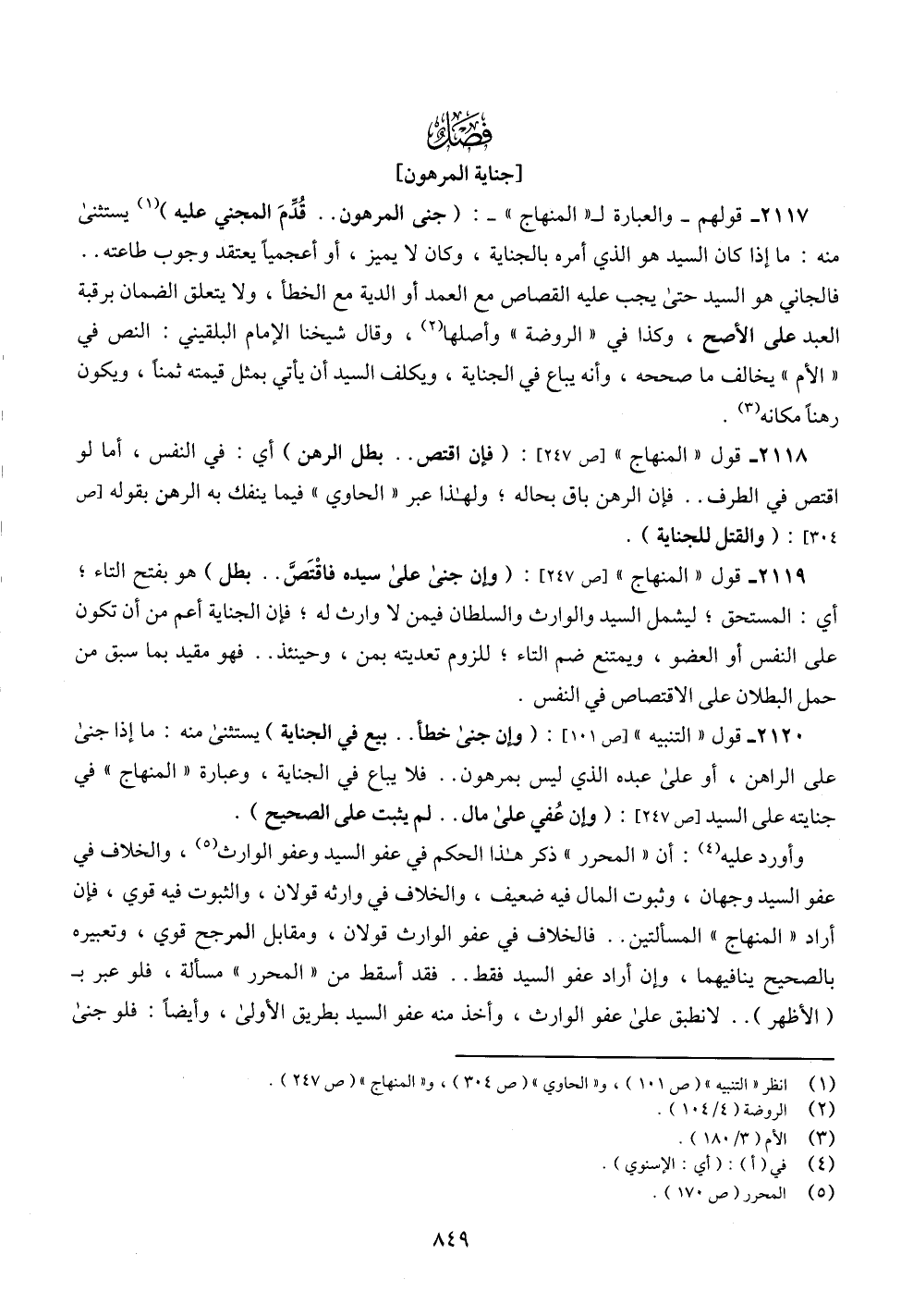 2118 - قول "المنهاج" [ص 247]: (فإن اقتص .. بطل الرَّهْن) أي: في النفس، أما لو اقتص في الطرف .. فإن الرَّهْن باق بحاله، ولهذا عبر "الحاوي" فيما ينفك به الرَّهْن بقوله [ص 304]: (والقتل للجناية).