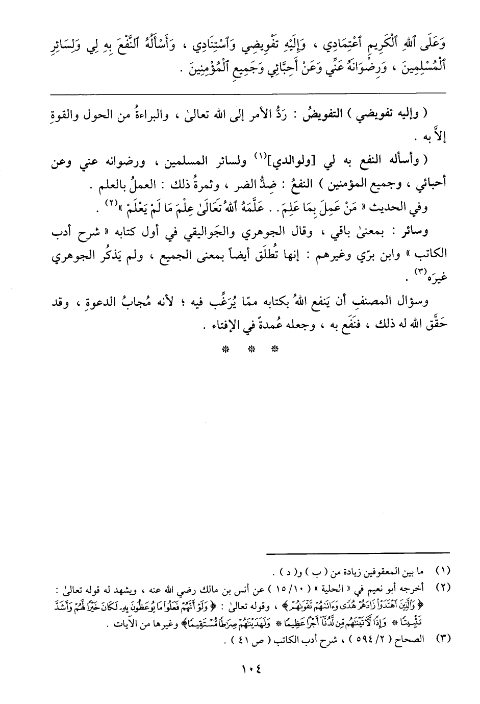 (وأسأله النفع به لي [ولوالدي] (١) ولسائر المسلمين، ورضوانه عني وعن أحبائي، وجميع المؤمنين) النفعُ: ضِدُّ الضر، وثمرةُ ذلك: العملُ بالعلم.