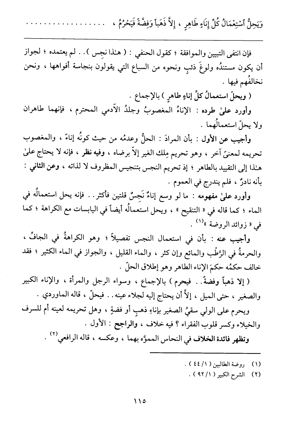 وأجيب عن الأول: بأن المرادَ: الحلُّ وعدمُه من حيث كونُه إناءً، والمغصوب تحريمه لمعنىً آخر، وهو تحريم مِلك الغير إلَّا برضاه، وفيه نظر، فإنه لا يحتاج على هذا إلى التقييد بالطاهر؛ إذ تحريم النجس بتنجيس المظروف لا لذاته، وعن الثاني: بأنه نادرٌ، فلم يندرج في العموم.