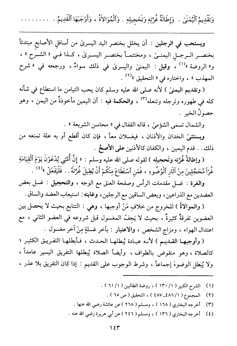 والغرة: غسل مقدمات الرأس وصفحة العنق مع الوجه، والتحجيل: غسل بعض العضدين مع الذراعين، وبعض الساقين مع الرجلين، وغايته: استيعاب العضد والساق.