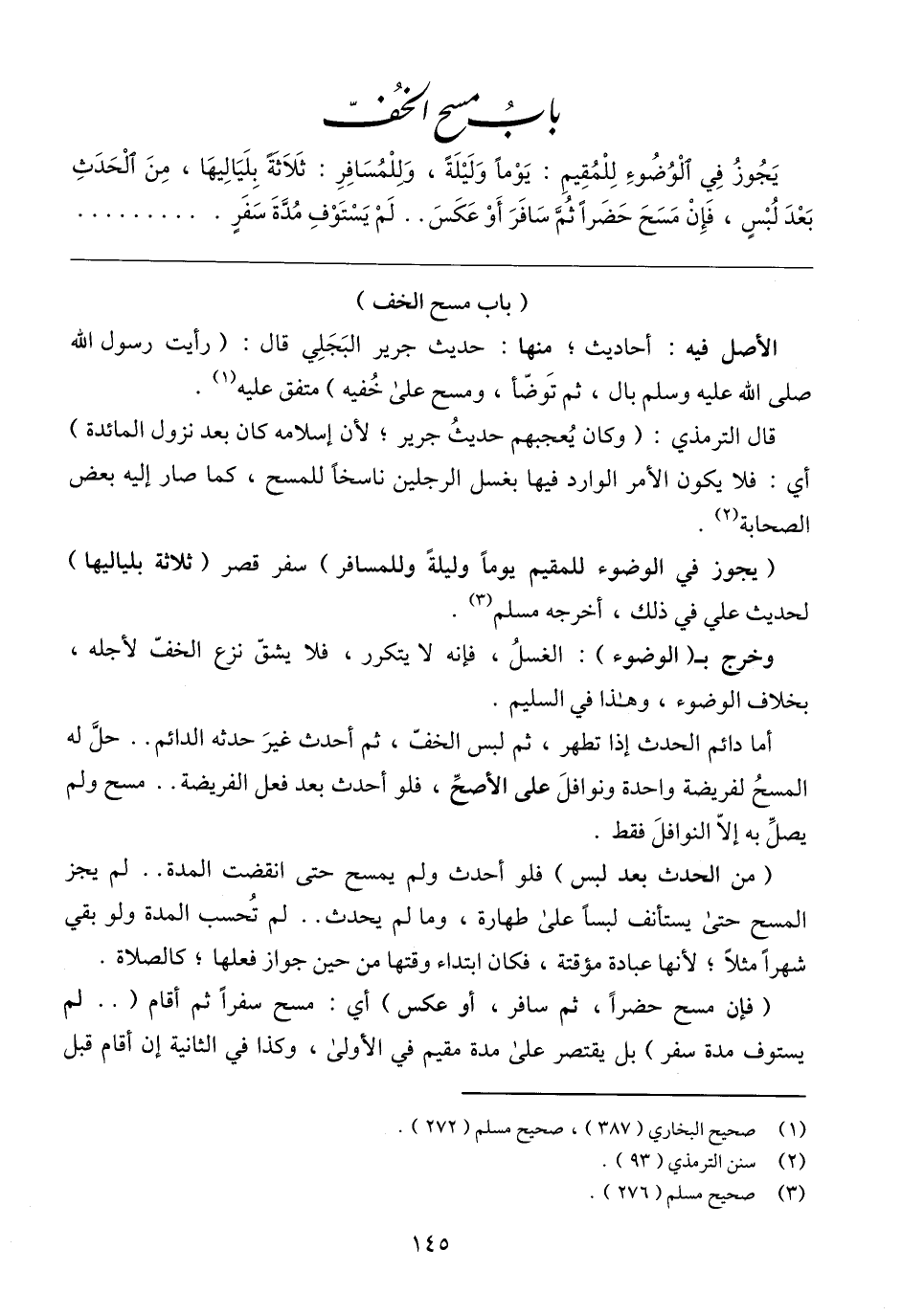 (يجوز في الوضوء للمقيم يومًا وليلةً وللمسافر) سفر قصر (ثلاثة بلياليها) لحديث علي في ذلك، أخرجه مسلم (٣).
