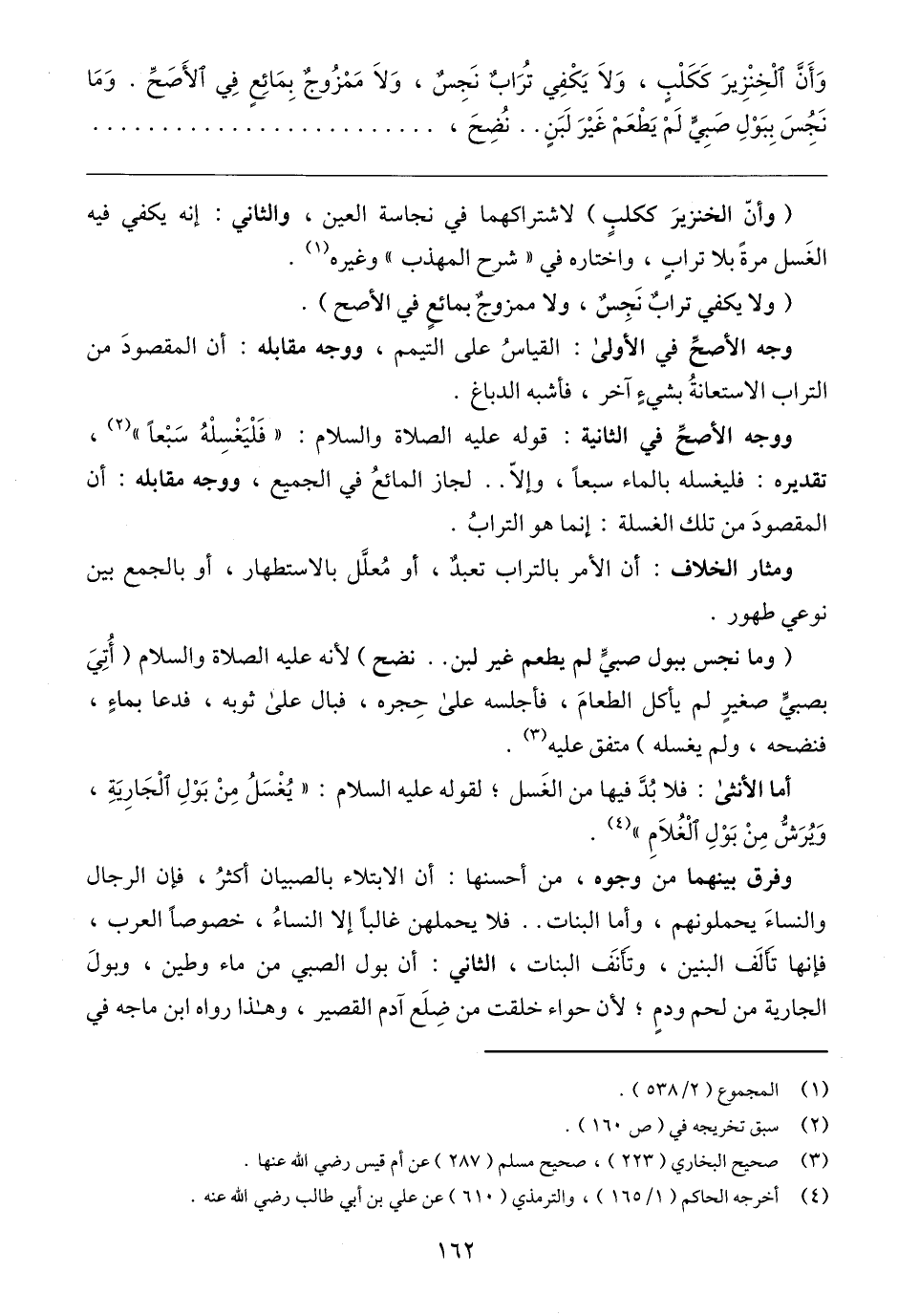 (وما نجس ببول صبيٍّ لم يطعم غير لبن .. نضح) لأنه عليه الصلاة والسلام (أُتِيَ بصبيٍّ صغيرٍ لم يأكل الطعامَ، فأجلسه على حِجره، فبال على ثوبه، فدعا بماءٍ، فنضحه، ولم يغسله) متفق عليه (٣).