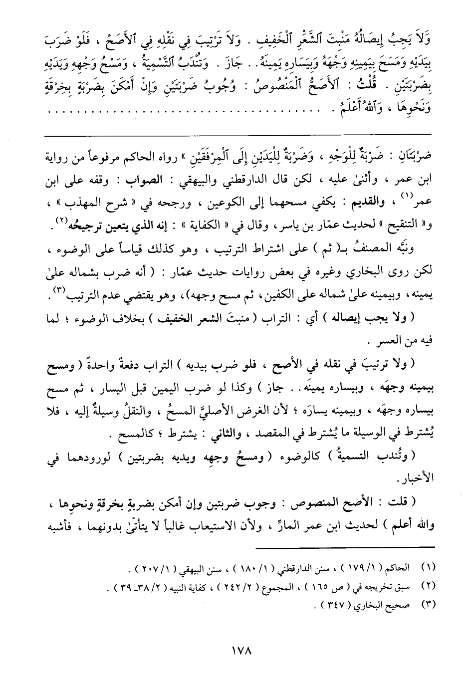 ونَبَّه المصنفُ بـ (ثم) على اشتراط الترتيب، وهو كذلك قياسًا على الوضوء، لكن روى البخاري وغيره في بعض روايات حديث عمّار: (أنه ضرب بشماله على يمينه، وبيمينه على شماله على الكفين، ثم مسح وجهه)، وهو يقتضي عدم الترتيب (٣).