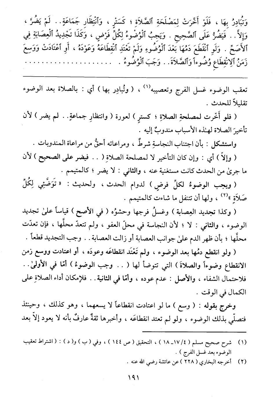 تعقب الوضوء غسل الفرج وتعصيبه (١)، (وتُبادِر بها) أي: بالصلاة بعد الوضوء تقليلًا للحدث.