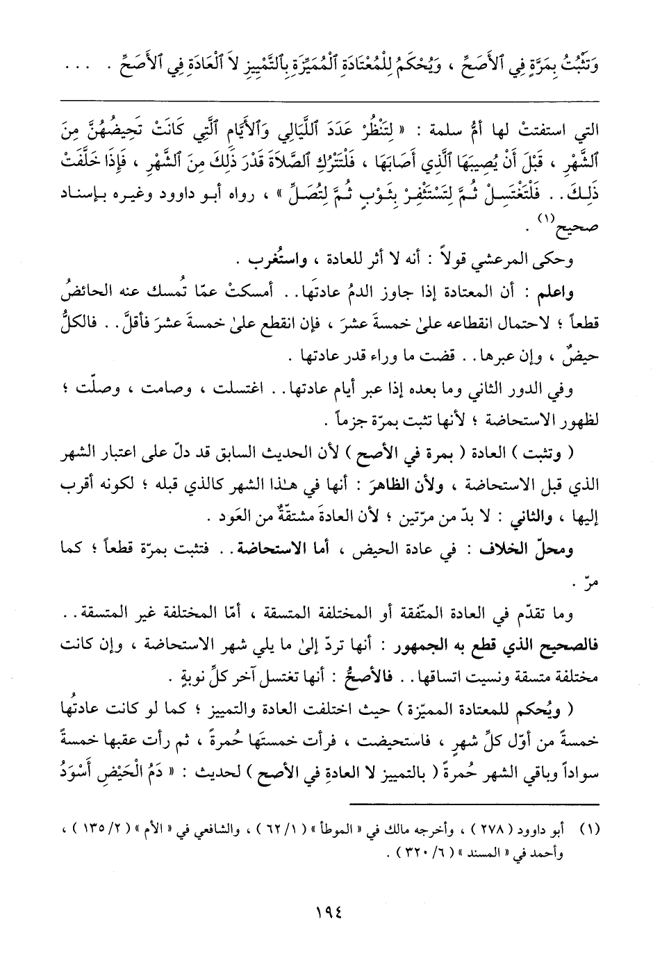 التي استفتتْ لها أمُّ سلمة: "لِتَنْظُرْ عَدَدَ اللَّيَالِي وَالأيَّام الَّتِي كَانَتْ تَحِيضُهُنَّ مِنَ الشَّهْرِ، قَبْلَ أَنْ يُصِيبَهَا الَّذِي أَصَابَهَا، فَلْتَتْرُكِ الصَّلَاةَ قَدْرَ ذلِكَ مِنَ الشَّهْرِ، فَإِذَا خَلَّفَتْ ذَلِكَ .. فَلْتَغْتَسِلْ ثُمَّ لِتَسْتَثْفِرْ بِثَوْبٍ ثُمَّ لِتُصَلِّ"، رواه أبو داوود وغيره بإسناد صحيح (١).