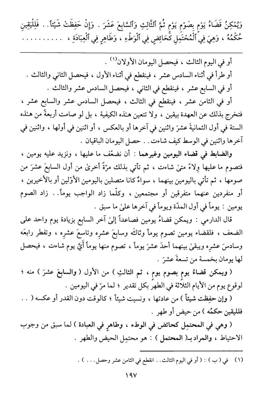 قال الدارمي: ويمكن قضاءُ يومين فصاعدًا إلى آخر السابع بزيادة يوم واحد على الضعف، فلقضاء يومين تصوم يوما وثالثَه وسابعَ عشرِه وتاسعَ عشرِه، وتفطر رابعَه وسادسَ عشرِه ويبقى بينهما أحدَ عشرَ يومًا، تصوم منها يومًا أَيَّ يوم شاءت، فيحصل لها يومان بخمسة من تسعةَ عشرَ.