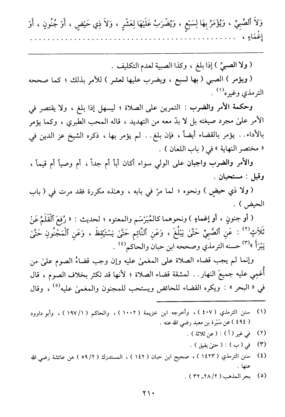 (أو جنونٍ، أو إغماءٍ) ونحوهما كالمُبَرْسَم والمعتوه؛ لحديث: "رُفِعَ الْقَلَمُ عَنْ ثَلَاثٍ (٢): عَنِ الصَّبِيِّ حَتَّى يَبْلُغَ، وَعَنِ النَّائِمِ حَتَّى يَسْتَيْقِظَ، وَعَنِ الْمَجْنُونِ حَتَّى يَبْرَأَ" (٣) حسنه الترمذي وصححه ابن حبان والحاكم (٤).