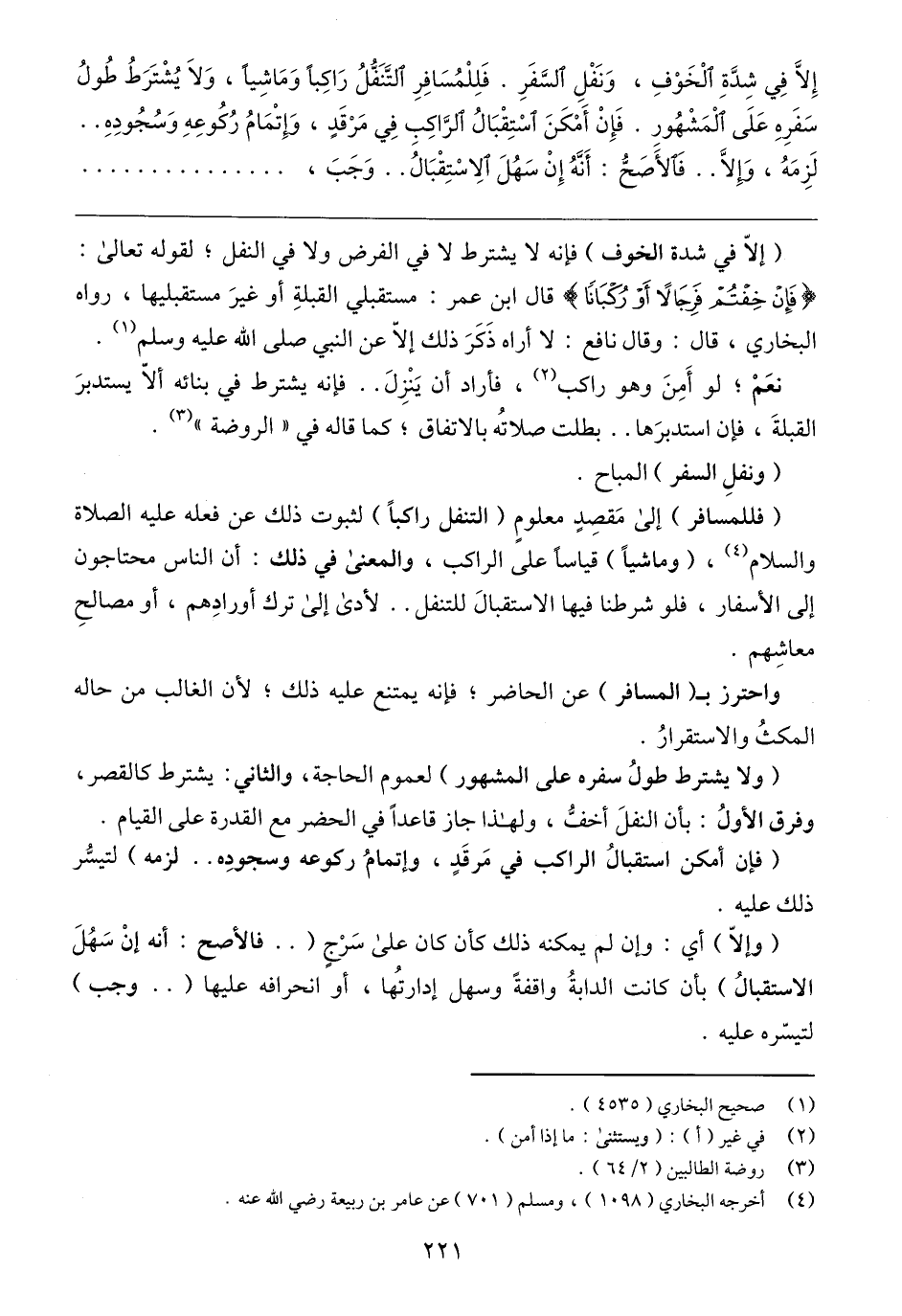 (فللمسافر) إلى مَقصِدٍ معلومٍ (التنفل راكبًا) لثبوت ذلك عن فعله عليه الصلاة والسلام (٤)، (وماشيًا) قياسا على الراكب، والمعنى في ذلك: أن الناس محتاجون إلى الأسفار، فلو شرطنا فيها الاستقبالَ للتنفل .. لأدى إلى ترك أورادِهم، أو مصالحِ معاشِهم.