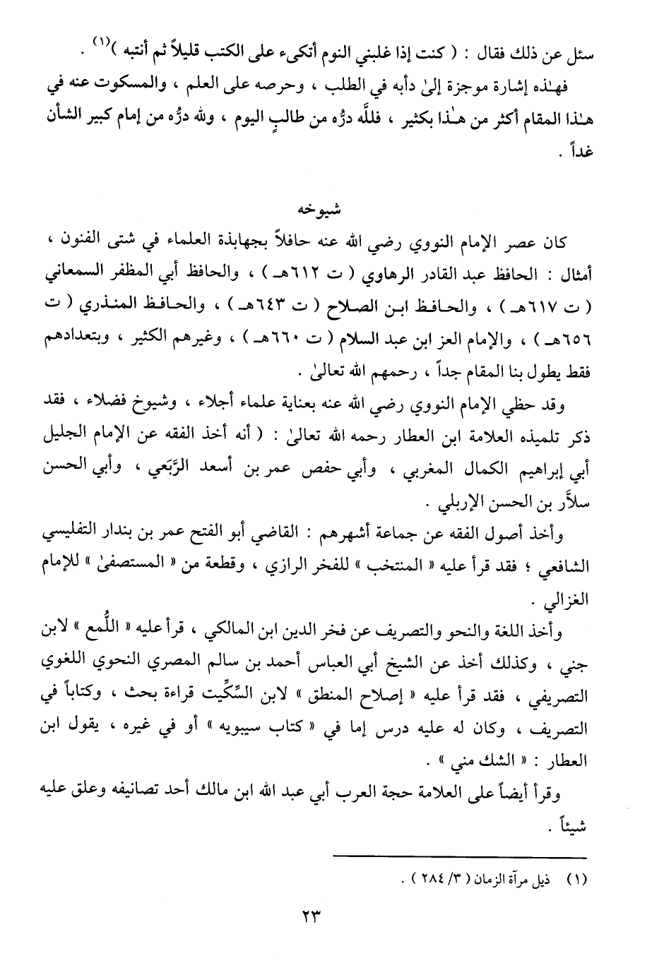 وقد حظي الإمام النووي رضي الله عنه بعناية علماء أجلاء، وشيوخ فضلاء، فقد ذكر تلميذه العلامة ابن العطار رحمه الله تعالى: (أنه أخذ الفقه عن الإمام الجليل أبي إبراهيم الكمال المغربي، وأبي حفص عمر بن أسعد الرَّبَعي، وأبي الحسن سلَّار بن الحسن الإربلي.