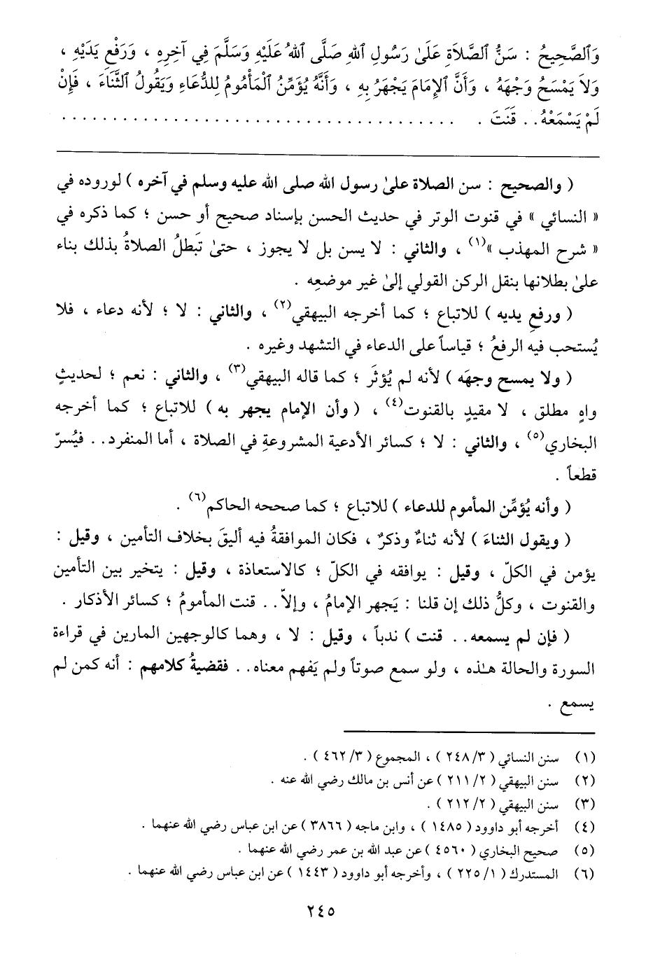 (ولا يمسح وجهَه) لأنه لم يُؤثَر؛ كما قاله البيهقي (٣)، والثاني: نعم؛ لحديثٍ واهٍ مطلق، لا مقيدٍ بالقنوت (٤)، (وأن الإمام يجهر به) للاتباع؛ كما أخرجه البخاري (٥)، والثاني: لا؛ كسائر الأدعية المشروعةِ في الصلاة، أما المنفرد .. فيُسرّ قطعًا.