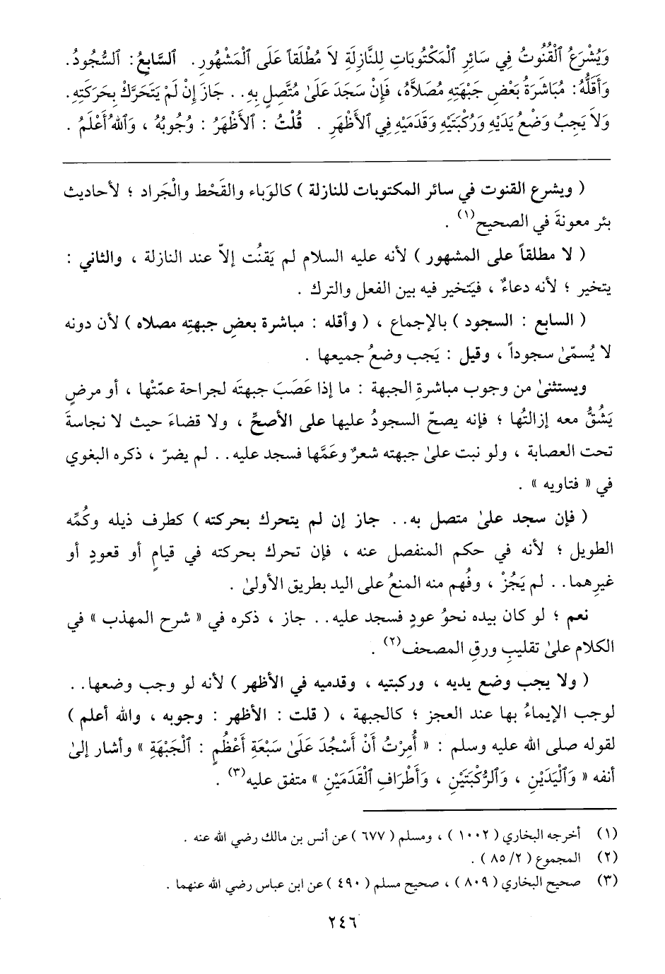 (ولا يجب وضع يديه، وركبتيه، وقدميه في الأظهر) لأنه لو وجب وضعها .. لوجب الإيماءُ بها عند العجز؛ كالجبهة، (قلت: الأظهر: وجوبه، والله أعلم) لقوله صلى الله عليه وسلم: "أُمِرْتُ أَنْ أَسْجُدَ عَلَى سَبْعَةِ أَعْظُمٍ: الْجَبْهَةِ" وأشار إلى أنفه "وَالْيَدَيْنِ، وَالرُّكْبَتَيْنِ، وَأَطْرَافِ الْقَدَمَيْنِ" متفق عليه (٣).