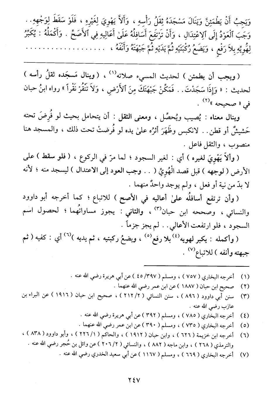 (ويجب أن يطمئن) لحديث المسيء صلاته (١)، (وينال مَسجَده ثقلُ رأسه) لحديث: "وَإِذَا سَجَدْتَ .. فَمَكِّنْ جَبْهَتَكَ مِنَ الأَرْضِ، وَلَا تَنْقُرْ نَقْرًا" رواه ابنُ حبان في "صحيحه" (٢).
