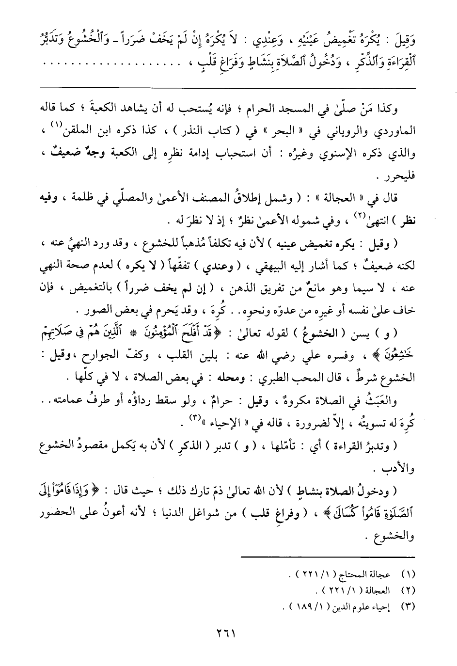 والعَبَثُ في الصلاة مكروهٌ، وقيل: حرامٌ، ولو سقط رداؤُه أو طرفُ عمامته .. كُرِهَ له تسويتُه، إلّا لضرورة، قاله في "الإحياء" (٣).