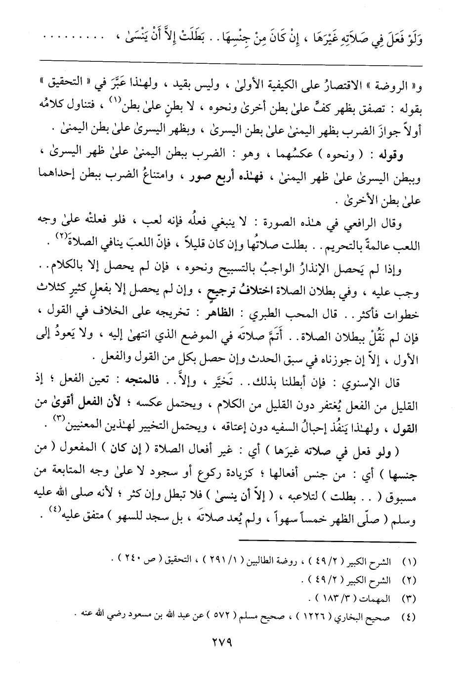 وقال الرافعي في هذه الصورة: لا ينبغي فعلُه فإنه لعب، فلو فعلتْه على وجه اللعب عالمةً بالتحريم .. بطلت صلاتُها وإن كان قليلًا، فإنّ اللعبَ ينافي الصلاةَ (٢).
