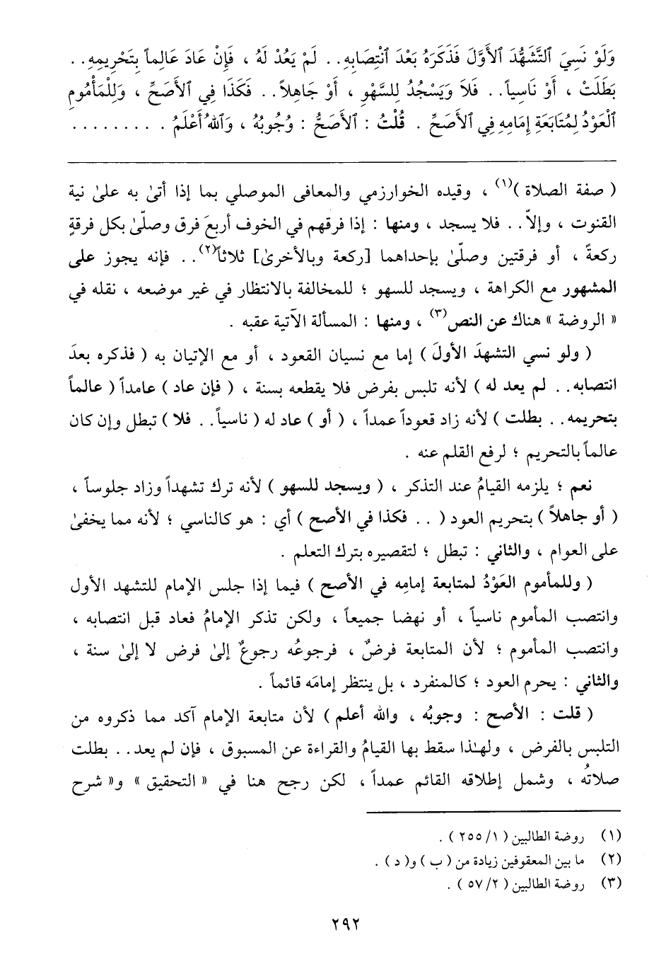 (صفة الصلاة) (١)، وقيده الخوارزمي والمعافى الموصلى بما إذا أتى به على نية القنوت، وإلّا .. فلا يسجد، ومنها: إذا فرقهم في الخوف أربعَ فرق وصلّى بكل فرقةٍ ركعةً، أو فرقتين وصلّى بإحداهما [ركعة وبالأخرى] ثلاثًا (٢) .. فإنه يجوز على المشهور مع الكراهة، ويسجد للسهو؛ للمخالفة بالانتظار في غير موضعه، نقله في "الروضة" هناك عن النص (٣)، ومنها: المسألة الآتية عقبه.