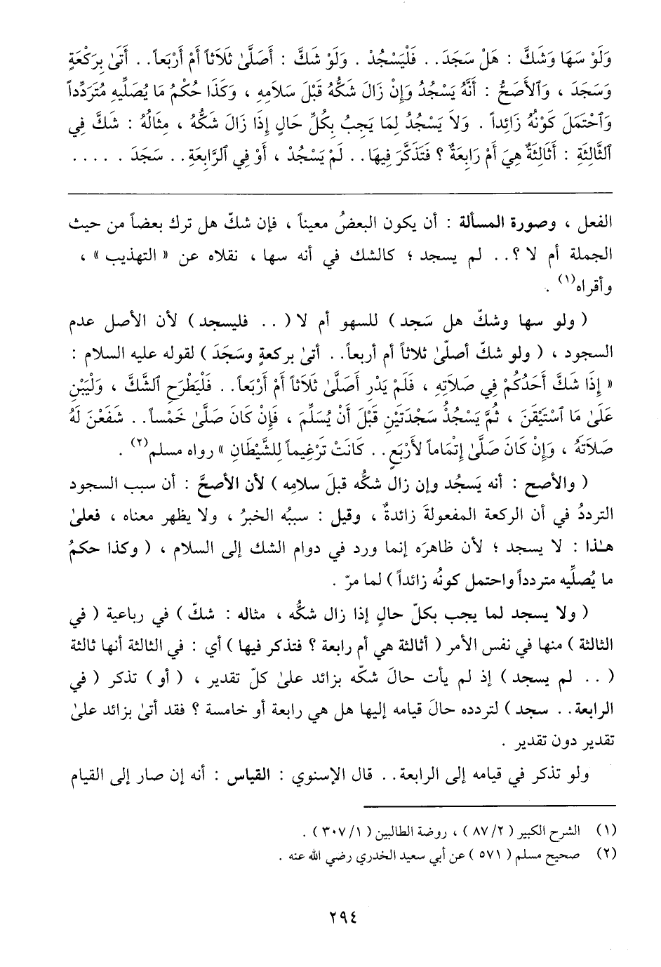 (ولو سها وشكّ هل سَجد) للسهو أم لا ( .. فليسجد) لأن الأصل عدم السجود، (ولو شكّ أصلّى ثلاثًا أم أربعًا .. أتى بركعةٍ وسَجَدَ) لقوله عليه السلام: "إِذَا شَكَّ أَحَدُكُمْ فِي صَلَاتِهِ، فَلَمْ يَدْرِ أَصَلَّى ثَلَاثًا أَمْ أَرْبَعًا .. فَلْيَطْرَحِ الشَّكَّ، وَلْيَبْنِ عَلَى مَا اسْتَيْقَنَ، ثُمَّ يَسْجُد سَجْدَتينِ قَبْلَ أَنْ يُسَلِّمَ، فَإِنْ كَانَ صَلَّى خَمْسًا .. شَفَعْنَ لَهُ صَلَاتَهُ، وَإِنْ كَانَ صَلَّى إِتْمَامًا لأَرْبَعٍ .. كَانَتْ تَرْغِيمًا لِلشَّيْطَانِ" رواه مسلم (٢).