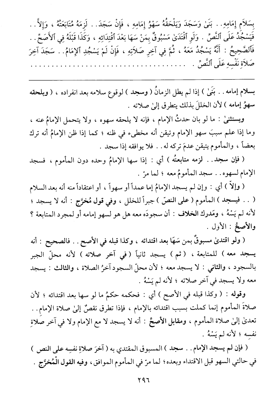 (فإن لم يسجد الإمام .. سجد) المسبوق المقتدي به (آخرَ صلاةِ نفسِه على النص) في حالتي السهو قبل الاقتداء وبعده؛ لما مرّ في المأموم الموافق، وفيه القول الْمُخرَّج.