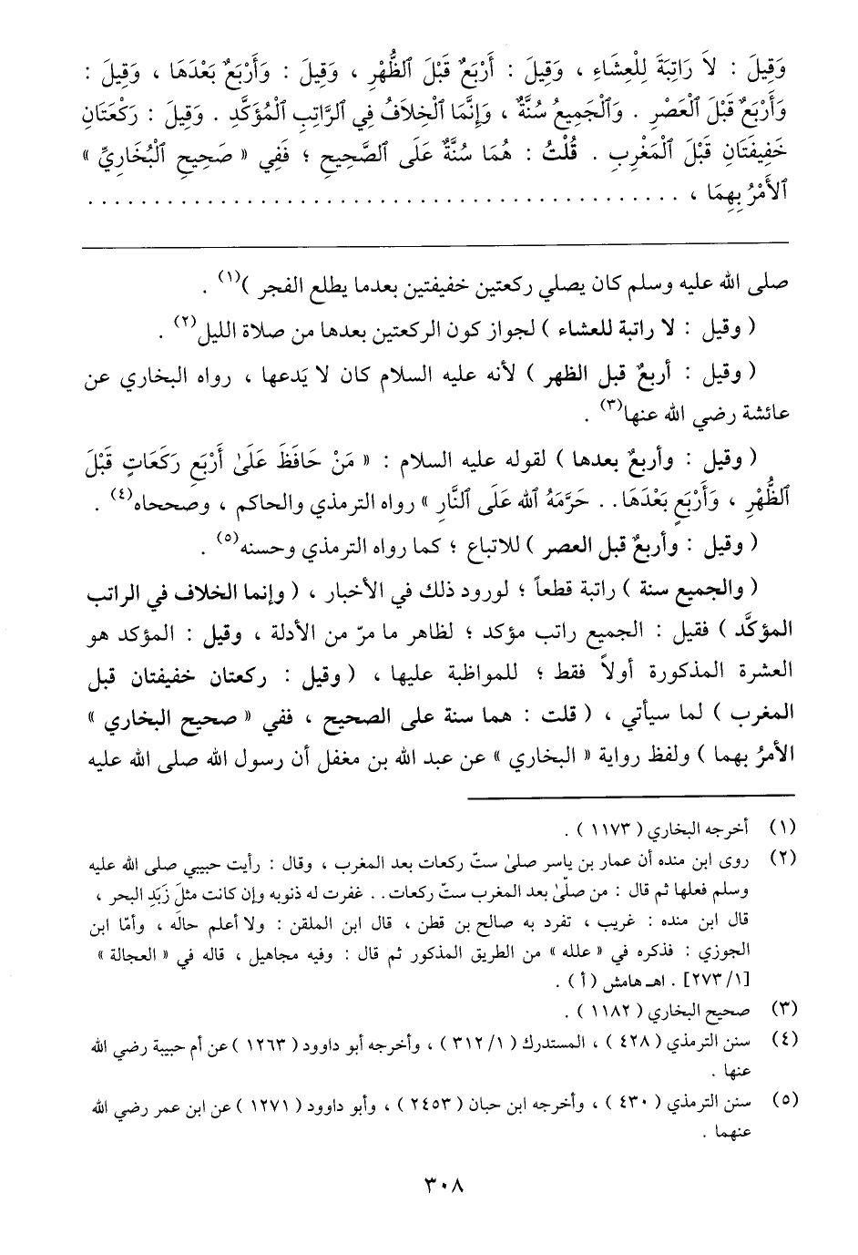 (والجميع سنة) راتبة قطعًا؛ لورود ذلك في الأخبار، (وإنما الخلاف في الراتب المؤكَّد) فقيل: الجميع راتب مؤكد، لظاهر ما مرّ من الأدلة، وقيل: المؤكد هو العشرة المذكورة أولًا فقط، للمواظبة عليها، (وقيل: ركعتان خفيفتان قبل المغرب) لما سيأتي، (قلت: هما سنة على الصحيح، ففي "صحيح البخاري" الأمرُ بهما) ولفظ رواية "البخاري" عن عبد الله بن مغفل أن رسول الله صلى الله عليه