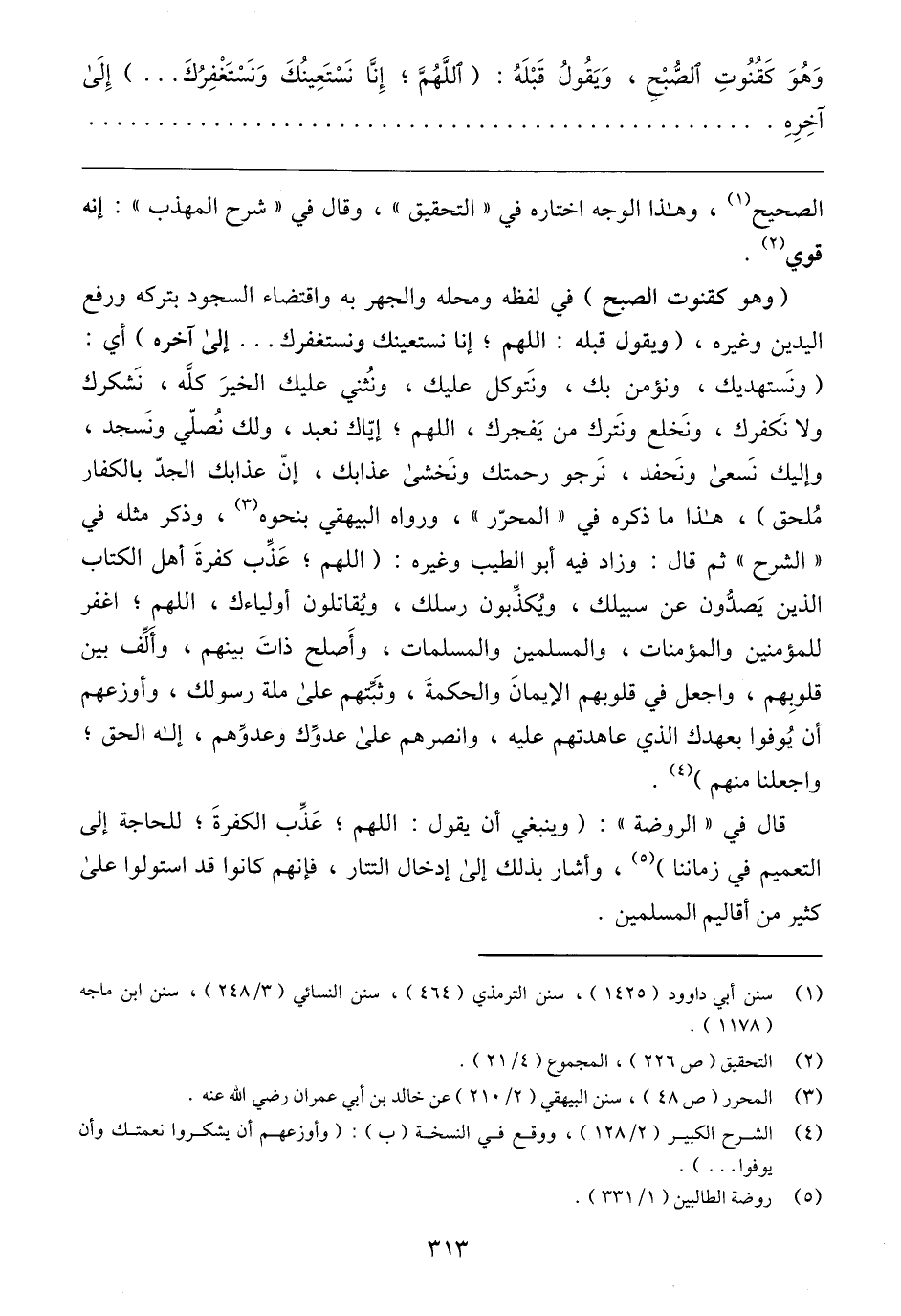 (وهو كقنوت الصبح) في لفظه ومحله والجهر به واقتضاء السجود بتركه ورفع اليدين وغيره، (ويقول قبله: اللهم؛ إنا نستعينك ونستغفرك ... إلى آخره) أي: (ونَستهديك، ونؤمن بك، ونَتوكل عليك، ونُثني عليك الخيرَ كلَّه، نَشكرك ولا نَكفرك، ونَخلع ونَترك من يَفجرك، اللهم؛ إيّاك نعبد، ولك نُصلّي ونَسجد، وإليك نَسعى ونَحفد، نَرجو رحمتك ونَخشى عذابك، إنّ عذابك الجدّ بالكفار مُلحق)، هذا ما ذكره في "المحرّر"، ورواه البيهقي بنحوه (٣)، وذكر مثله في "الشرح" ثم قال: وزاد فيه أبو الطيب وغيره: (اللهم؛ عَذِّب كفرةَ أهل الكتاب الذين يَصدُّون عن سبيلك، ويُكذِّبون رسلك، ويُقاتلون أولياءك، اللهم؛ اغفر للمؤمنين والمؤمنات، والمسلمين والمسلمات، وأَصلح ذاتَ بينهم، وأَلِّف بين قلوبِهم، واجعل في قلوبهم الإيمانَ والحكمةَ، وثَبِّتهم على ملة رسولك، وأوزعهم أن يُوفوا بعهدك الذي عاهدتهم عليه، وانصرهم على عدوِّك وعدوِّهم، إله الحق؛ واجعلنا منهم) (٤).