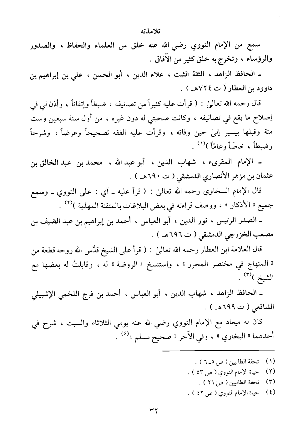 قال العلامة ابن العطار رحمه الله تعالى: (قرأ على الشيخ قدَّس الله روحه قطعة من "المنهاج في مختصر المحرر"، واستنسخ "الروضة" له، وقابلتُ له بعضها مع الشيخ) (٣).