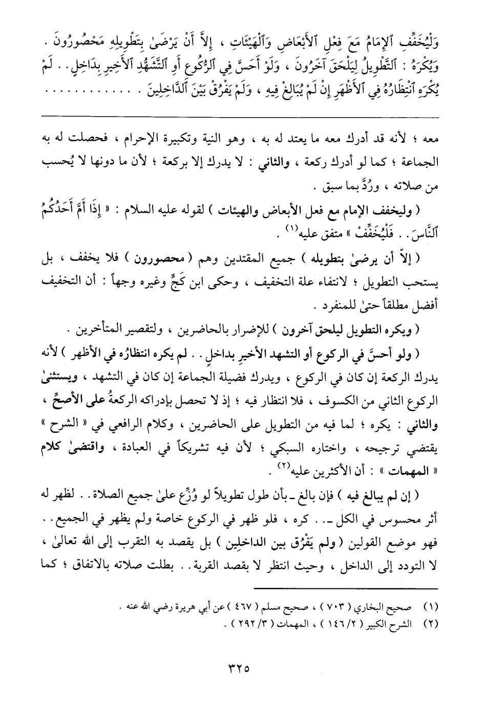 (إن لم يبالغ فيه) فإن بالغ -بأن طول تطويلًا لو وُزِّع على جميع الصلاة .. لظهر له أثر محسوس في الكل- .. كره، فلو ظهر في الركوع خاصة ولم يظهر في الجميع .. فهو موضع القولين (ولم يَفْرُق بين الداخلِين) بل يقصد به التقرب إلى الله تعالى، لا التودد إلى الداخل، وحيث انتظر لا بقصد القربة .. بطلت صلاته بالاتفاق؛ كما