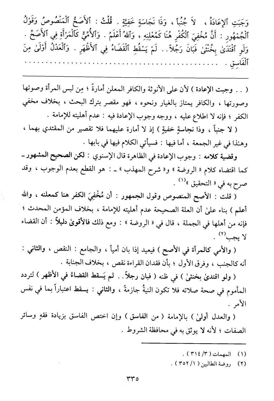 وقضية كلامه: وجوب الإعادة في الظاهرة قال الإسنوي: لكن الصحيح المشهور -كما اقتضاه كلام "الروضة" و"شرح المهذب"-: هو القطع بعدم الوجوب، وقد صرح به في "التحقيق" (١).