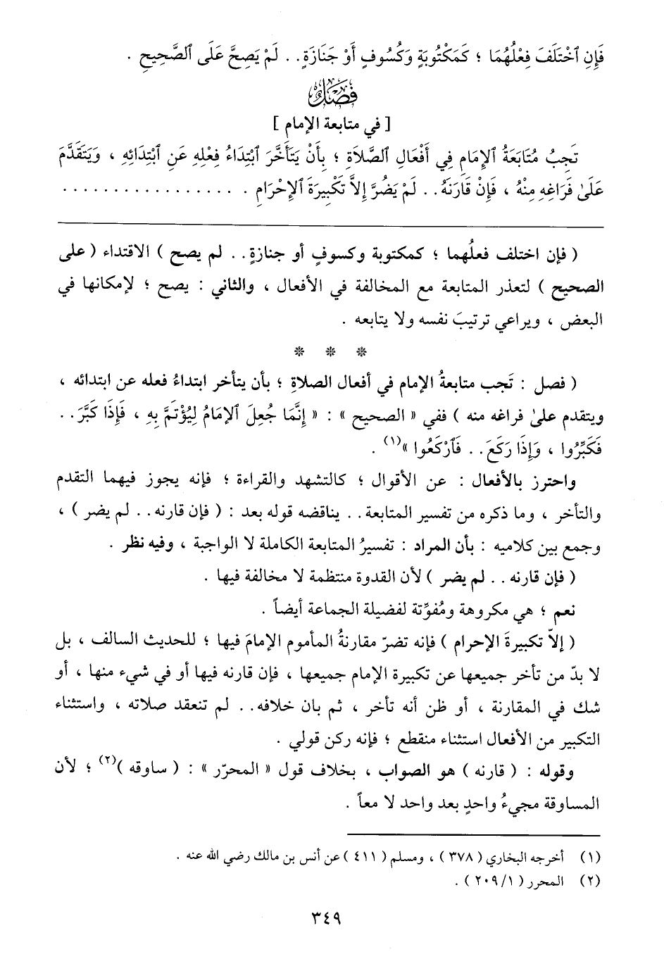 (فصل: تَجب متابعةُ الإمام في أفعال الصلاةِ؛ بأن يتأخر ابتداءُ فعله عن ابتدائه، ويتقدم على فراغه منه) ففي "الصحيح": "إِنَّمَا جُعِلَ الإمَامُ لِيُؤْتَمَّ بِهِ، فَإِذَا كَبَّرَ .. فَكَبِّرُوا، وَإِذَا رَكَعَ .. فَأرْكَعُوا" (١).