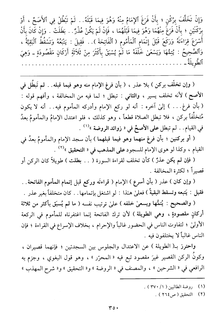 (وإن تخلّف بركن) بلا عذر، (بأن فرغ الإمام منه وهو فيما قبله .. لم تَبطُل في الأصح) لأنه تخلف يسير، والثاني: تبطل؛ لما فيه من المخالفة، وأفهم قوله: (بأن فرغ ... ) إلى آخره: أنه لو ركع الإمام وأدركه المأموم فيه .. أنه لا يكون مُتخلِّفًا بركن، فلا تبطل الصلاة قطعًا، وهو كذلك، فلو اعتدل الإمامُ والمأمومُ بعدُ في القيام .. لم تبطل على الأصحِّ في "زوائد الروضة" (١).