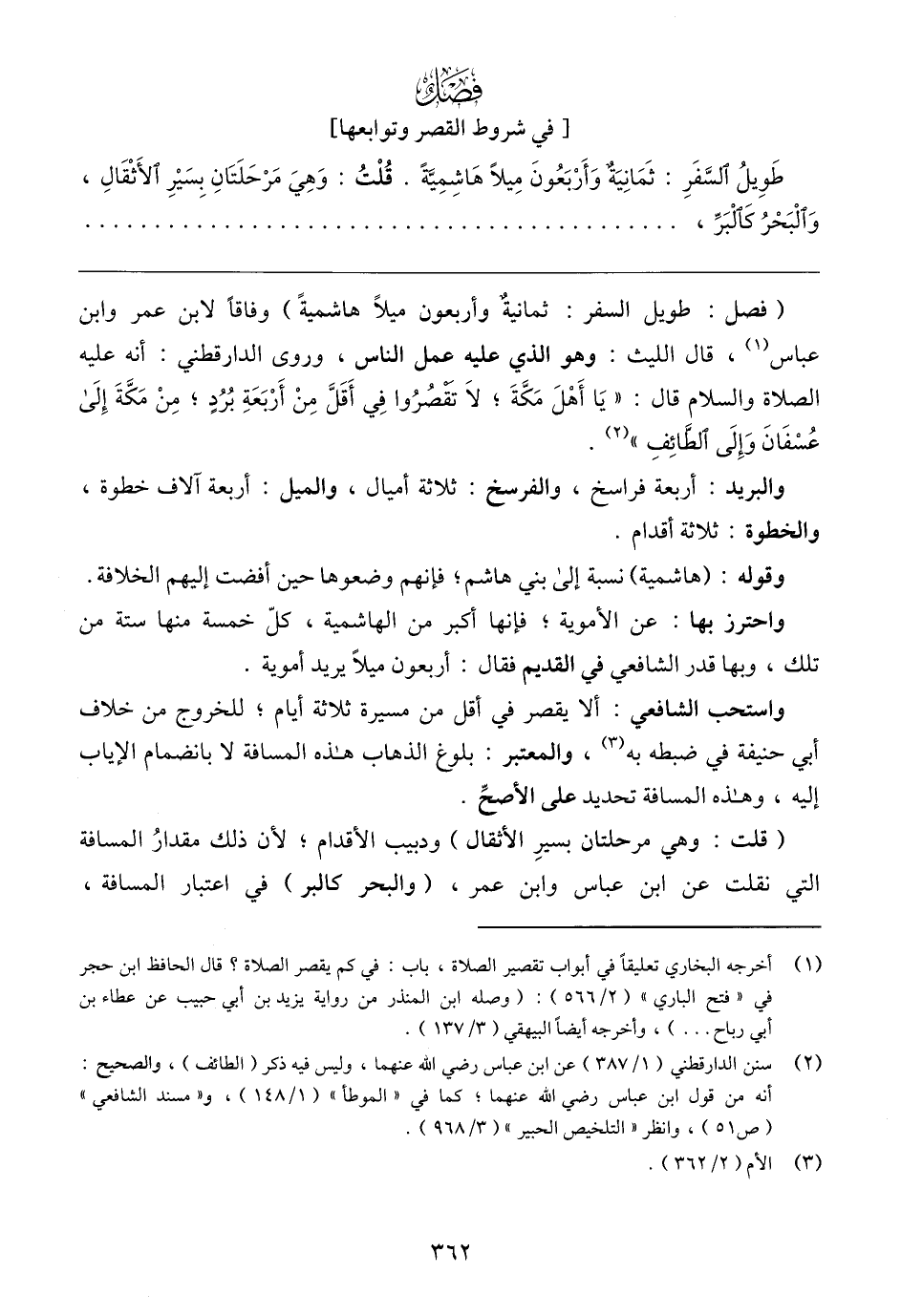 (فصل: طويل السفر: ثمانيةٌ وأربعون ميلًا هاشميةً) وفاقًا لابن عمر وابن عباس (١)، قال الليث: وهو الذي عليه عمل الناس، وروى الدارقطني: أنه عليه الصلاة والسلام قال: "يَا أَهْلَ مَكَّةَ؛ لَا تقصُرُوا فِي أَقَلَّ مِنْ أَرْبَعَةِ بُرُدٍ؛ مِنْ مَكَّةَ إِلَى عُسْفَانَ وَإِلَى الطَائِفِ" (٢).