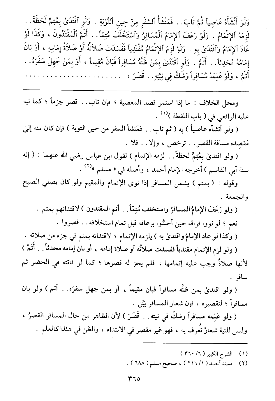 (ولو اقتدى بمن ظنَّه مسافرًا فبان مقيمًا، أو بمن جهل سفرَه .. أتم (ولو بان مسافرًا؛ لتقصيره، فإن شعار المسافر بَيِّن.