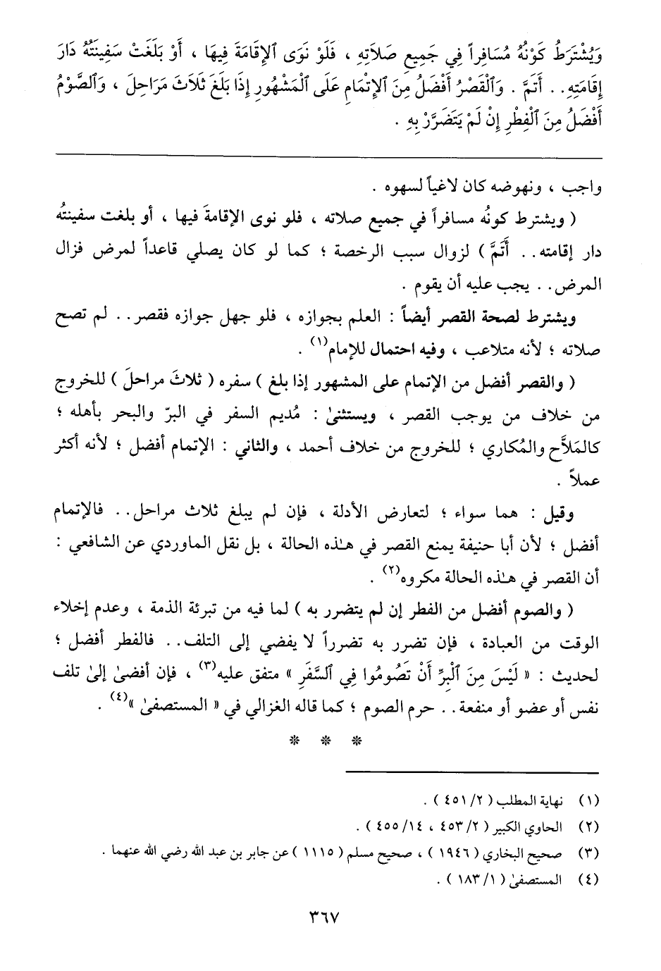 وقيل: هما سواء؛ لتعارض الأدلة، فإن لم يبلغ ثلاث مراحل .. فالإتمام أفضل؛ لأن أبا حنيفة يمنع القصر في هذه الحالة، بل نقل الماوردي عن الشافعي: أن القصر في هذه الحالة مكروه (٢).