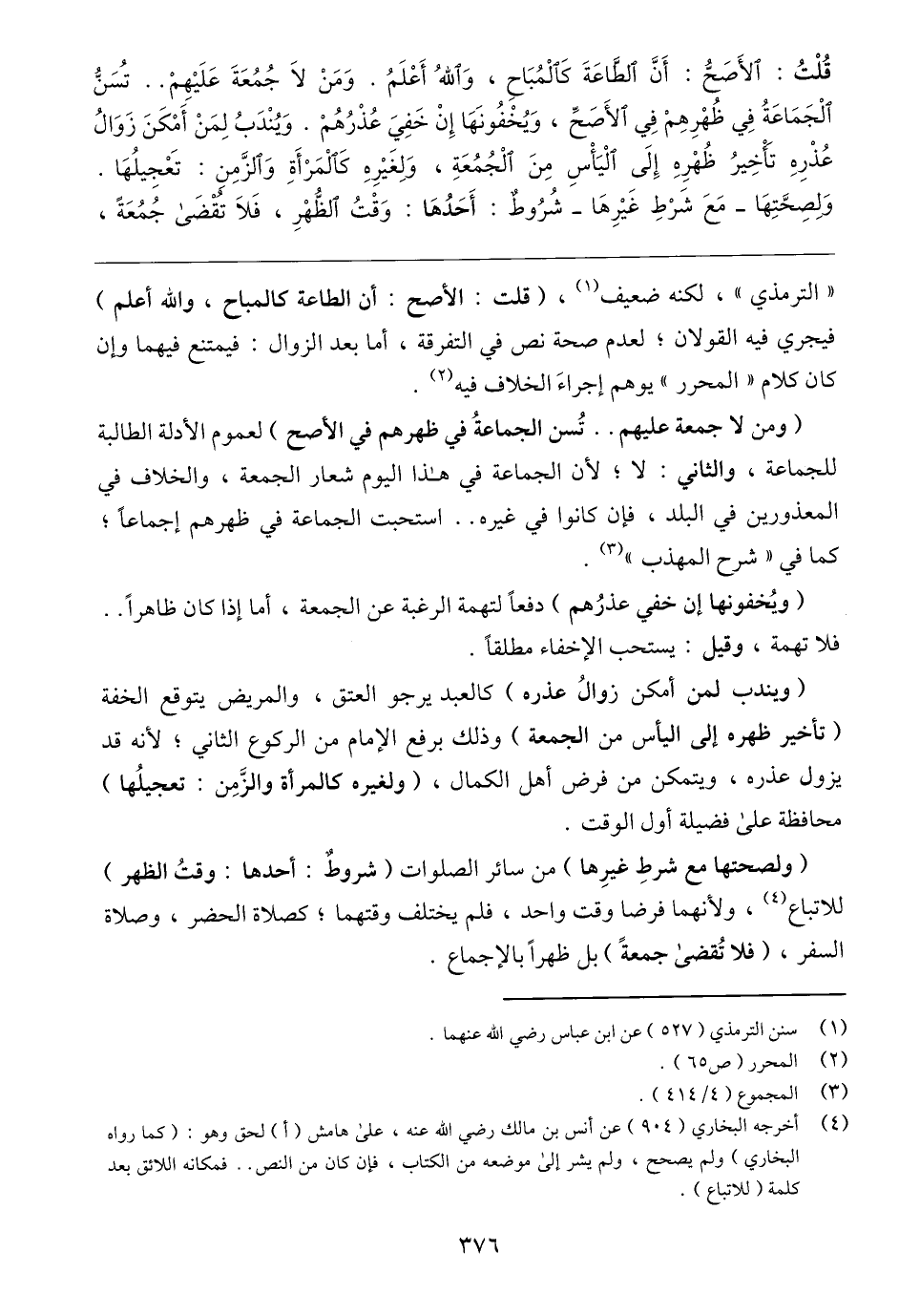 (ويندب لمن أمكن زوالُ عذره) كالعبد يرجو العتق، والمريض يتوقع الخفة (تأخير ظهره إلى اليأس من الجمعة) وذلك برفع الإمام من الركوع الثاني؛ لأنه قد يزول عذره، ويتمكن من فرض أهل الكمال، (ولغيره كالمرأة والزَّمِن: تعجيلُها) محافظة على فضيلة أول الوقت.