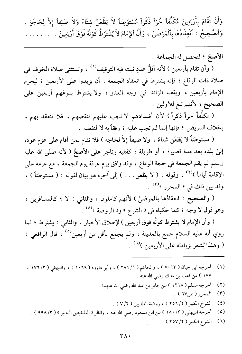 (وأن تقام بأربعين) لأنه أقلُّ عددٍ ثبت فيه التوقيف (١)، وتستثنى صلاة الخوف في صلاة ذات الرقاع؛ فإنه يشترط في انعقاد الجمعة: أن يزيدوا على الأربعين؛ ليحرم الإمام بأربعين، ويقف الزائد في وجه العدو، ولا يشترط بلوغهم أربعين على الصحيح؛ لأنهم تبع للأولين.