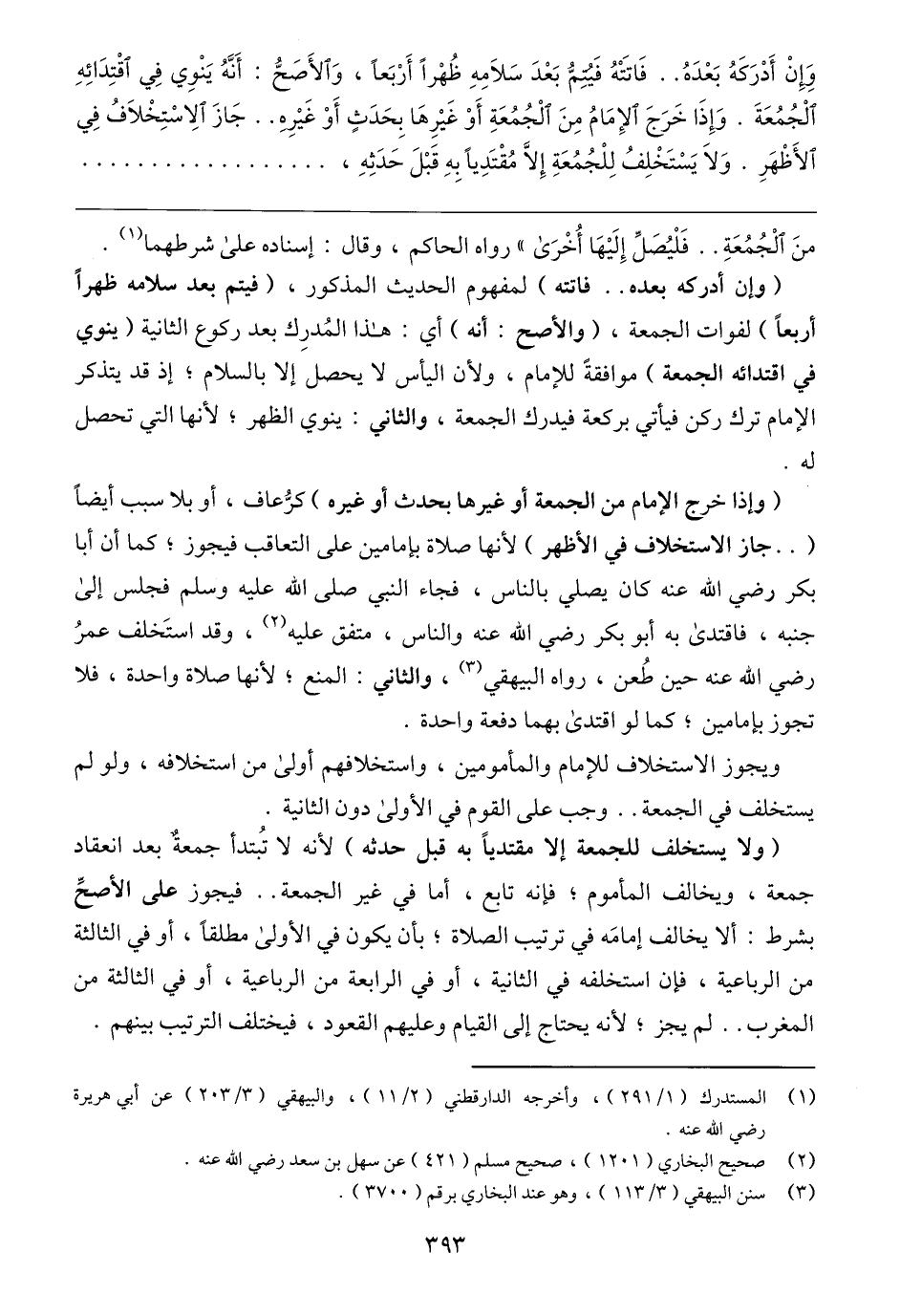 (ولا يستخلف للجمعة إلا مقتديًا به قبل حدثه) لأنه لا تُبتدأ جمعةٌ بعد انعقاد جمعة، ويخالف المأموم؛ فإنه تابع، أما في غير الجمعة .. فيجوز على الأصحِّ بشرط: ألا يخالف إمامَه في ترتيب الصلاة؛ بأن يكون في الأولى مطلقًا، أو في الثالثة من الرباعية، فإن استخلفه في الثانية، أو في الرابعة من الرباعية، أو في الثالثة من المغرب .. لم يجز؛ لأنه يحتاج إلى القيام وعليهم القعود، فيختلف الترتيب بينهم.