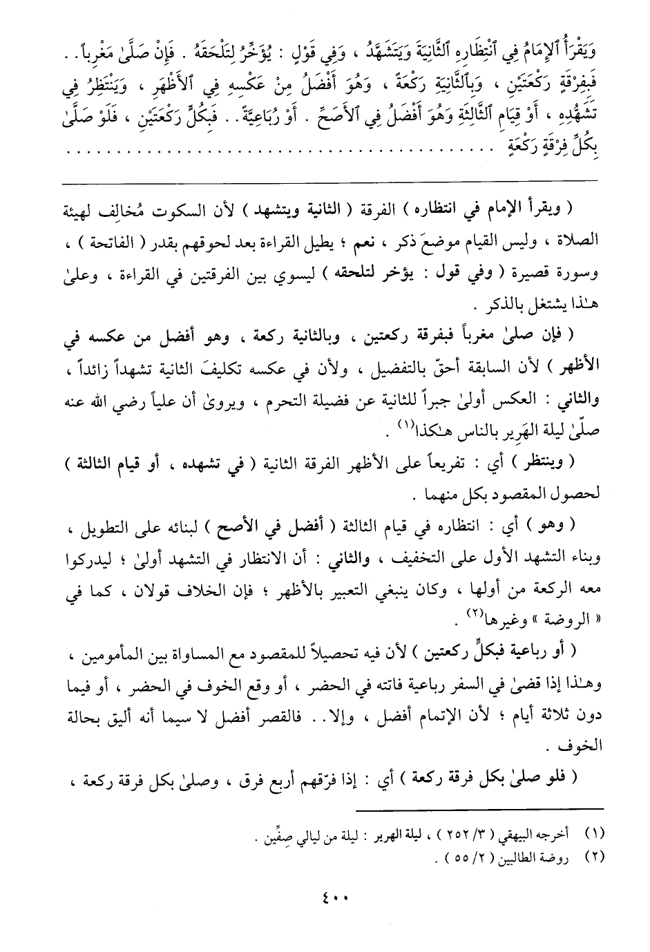 (ويقرأ الإمام في انتظاره) الفرقة (الثانية ويتشهد) لأن السكوت مُخالِف لهيئة الصلاة، وليس القيام موضعَ ذكر، نعم؛ يطيل القراءة بعد لحوقهم بقدر (الفاتحة)، وسورة قصيرة (وفي قول: يؤخر لتلحقه) ليسوي بين الفرقتين في القراءة، وعلى هذا يشتغل بالذكر.