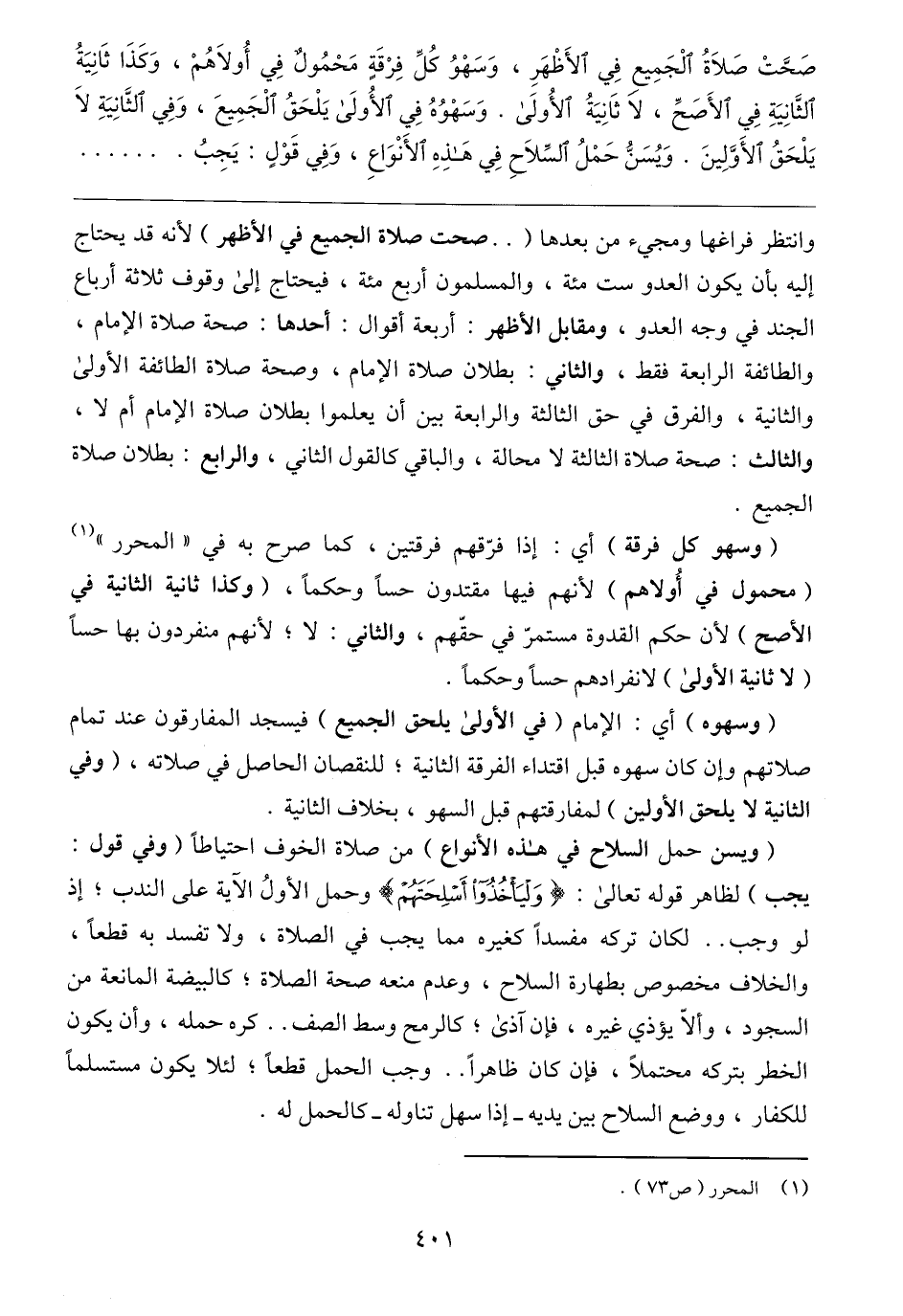 وانتظر فراغها ومجيء من بعدها ( .. صحت صلاة الجميع في الأظهر) لأنه قد يحتاج إليه بأن يكون العدو ست مئة، والمسلمون أربع مئة، فيحتاج إلى وقوف ثلاثة أرباع الجند في وجه العدو، ومقابل الأظهر: أربعة أقوال: أحدها: صحة صلاة الإمام، والطائفة الرابعة فقط، والثاني: بطلان صلاة الإمام، وصحة صلاة الطائفة الأولى والثانية، والفرق في حق الثالثة والرابعة بين أن يعلموا بطلان صلاة الإمام أم لا، والثالث: صحة صلاة الثالثة لا محالة، والباقي كالقول الثاني، والرابع: بطلان صلاة الجميع.