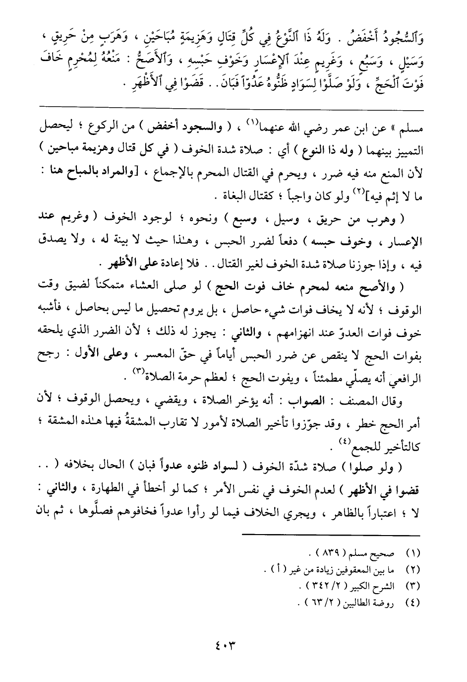 مسلم" عن ابن عمر رضي الله عنهما (١)، (والسجود أخفض) من الركوع؛ ليحصل التمييز بينهما (وله ذا النوع) أي: صلاة شدة الخوف (في كل قتال وهزيمة مباحين) لأن المنع منه فيه ضرر، ويحرم في القتال المحرم بالإجماع، [والمراد بالمباح هنا: ما لا إثم فيه] (٢) ولو كان واجبًا؛ كقتال البغاة.