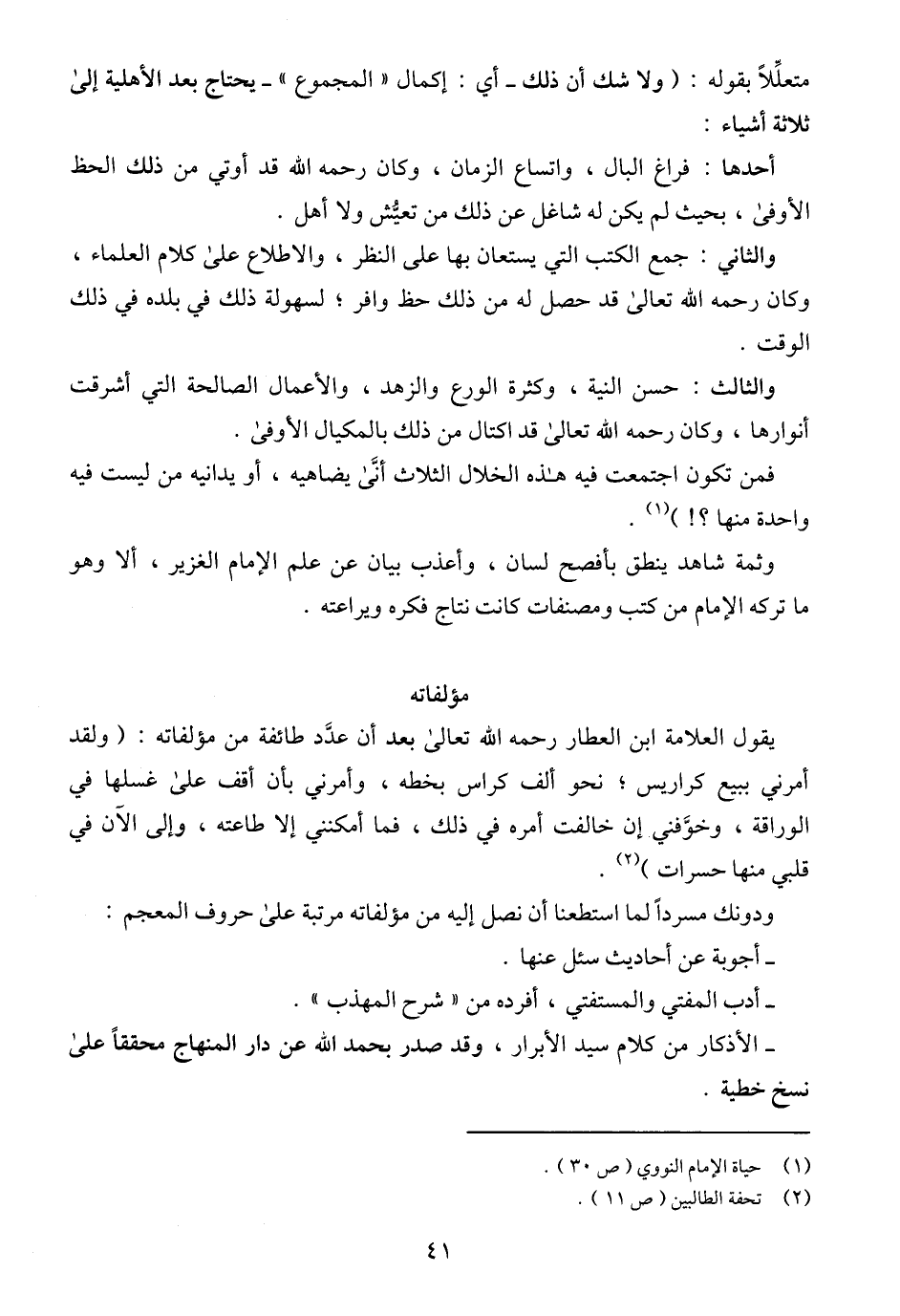 متعلِّلًا بقوله: (ولا شك أن ذلك - أي: إكمال "المجموع" - يحتاج بعد الأهلية إلى ثلاثة أشياء: