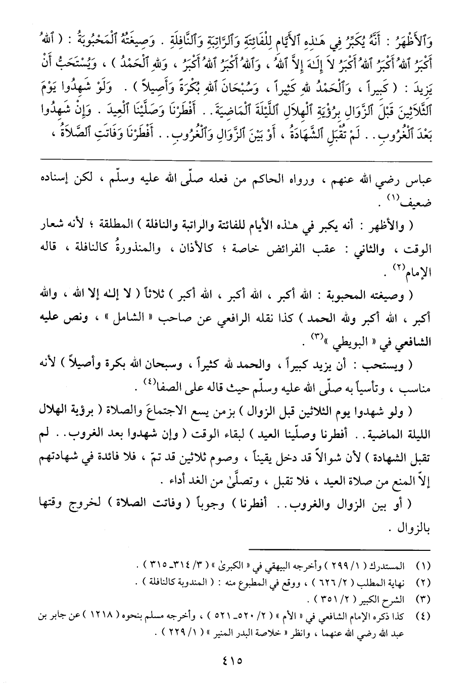 (وصيغته المحبوبة: الله أكبر، الله أكبر، الله أكبر) ثلاثًا (لا إله إلا الله، والله أكبر، الله أكبر ولله الحمد) كذا نقله الرافعي عن صاحب "الشامل"، ونص عليه الشافعي في "البويطي" (٣).