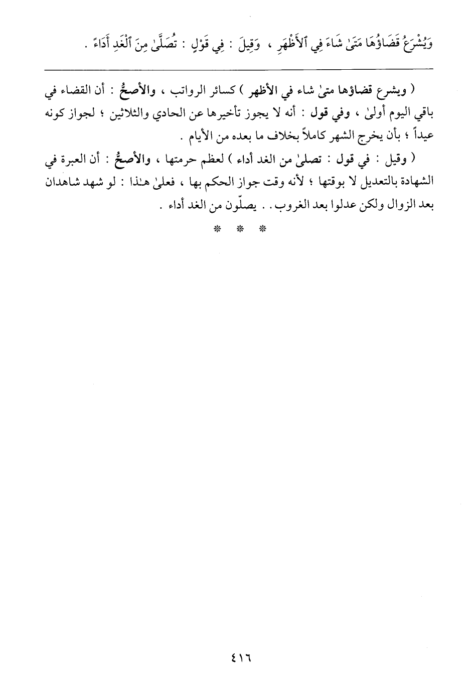 (وقيل: في قول: تصلى من الغد أداء) لعظم حرمتها، والأصحُّ: أن العبرة في الشهادة بالتعديل لا بوقتها؛ لأنه وقت جواز الحكم بها، فعلى هذا: لو شهد شاهدان بعد الزوال ولكن عدلوا بعد الغروب .. يصلّون من الغد أداء.